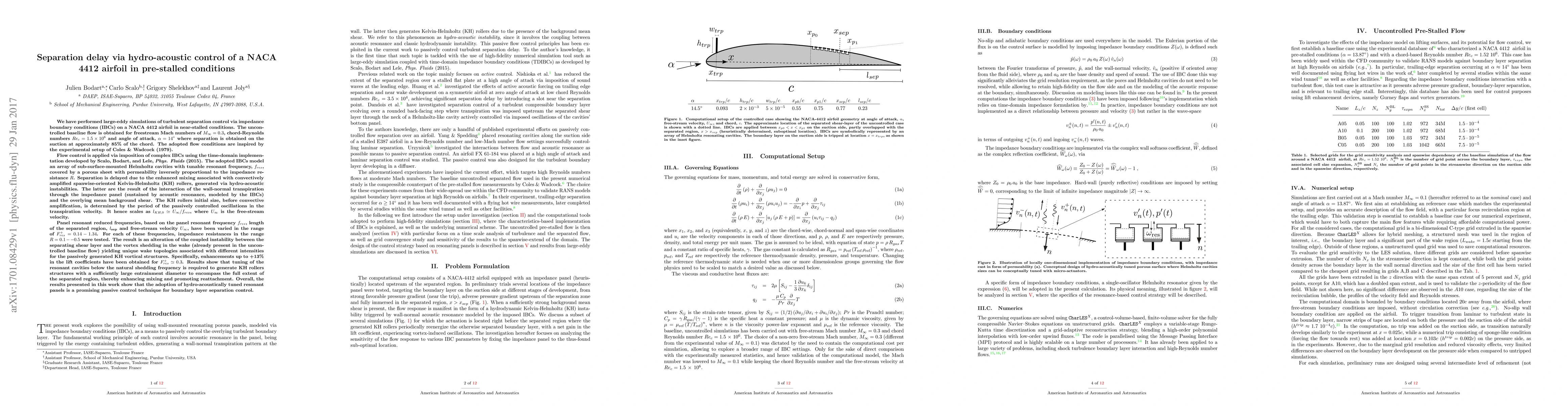 This study uses large-eddy simulations to demonstrate that hydro-acoustic control via impedance boundary conditions can delay turbulent separation on a NACA4412 airfoil in near-stall conditions, achieving up to a 13% increase in lift coefficients by generating spanwise-oriented Kelvin-Helmholtz rollers. The technique requires tuning resonant cavities to enhance mixing and promote flow reattachment.