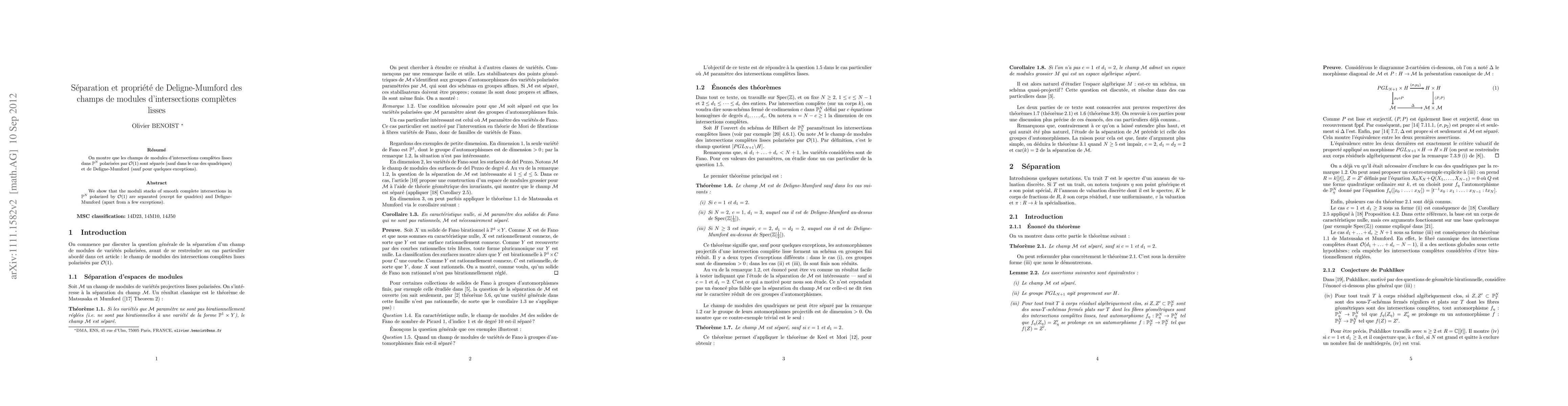 We show that the moduli stacks of smooth complete intersections in P^N polarized by O(1) are separated (except for quadrics) and Deligne-Mumford (apart from a few exceptions). ----- On montre que les champs de modules d'intersections completes lisses dans P^N polarisees par O(1) sont separes (sauf dans le cas des quadriques) et de Deligne-Mumford (sauf pour quelques exceptions).
