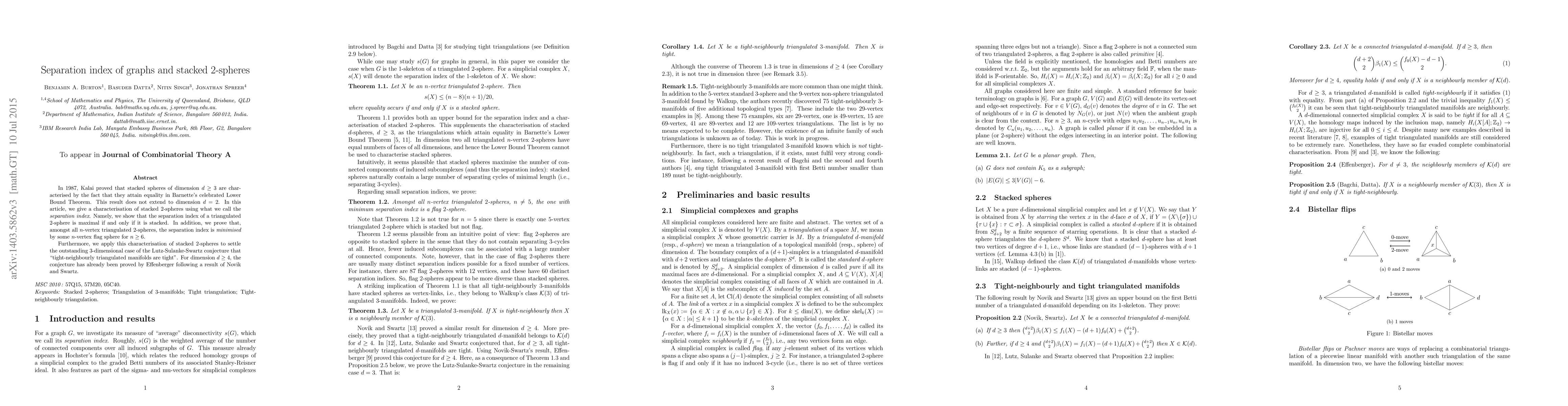 This paper characterizes stacked 2-spheres using the separation index, showing they maximize this index, and proves that among $n$-vertex triangulated 2-spheres for $n\geq 6$, the separation index is minimized by some $n$-vertex flag sphere. Additionally, it settles the 3D case of the Lutz-Sulanke-Swartz conjecture on tight-neighbourly triangulated manifolds.