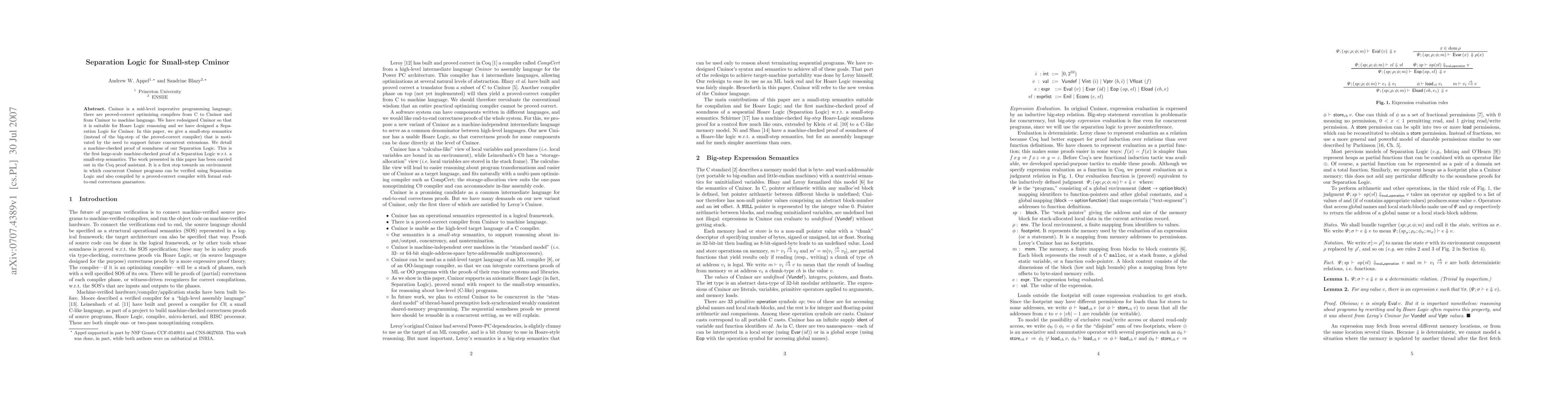 Cminor is a mid-level imperative programming language; there are proved-correct optimizing compilers from C to Cminor and from Cminor to machine language. We have redesigned Cminor so that it is suitable for Hoare Logic reasoning and we have designed a Separation Logic for Cminor. In this paper, we give a small-step semantics (instead of the big-step of the proved-correct compiler) that is motivated by the need to support future concurrent extensions. We detail a machine-checked proof of soundness of our Separation Logic. This is the first large-scale machine-checked proof of a Separation Logic w.r.t. a small-step semantics. The work presented in this paper has been carried out in the Coq proof assistant. It is a first step towards an environment in which concurrent Cminor programs can be verified using Separation Logic and also compiled by a proved-correct compiler with formal end-to-end correctness guarantees.