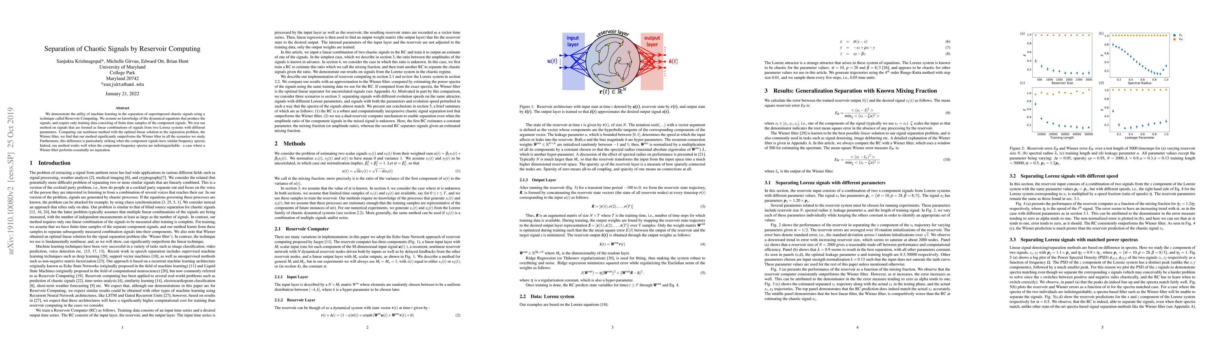 We demonstrate the utility of machine learning in the separation of superimposed chaotic signals using a technique called Reservoir Computing. We assume no knowledge of the dynamical equations that produce the signals, and require only training data consisting of finite time samples of the component signals. We test our method on signals that are formed as linear combinations of signals from two Lorenz systems with different parameters. Comparing our nonlinear method with the optimal linear solution to the separation problem, the Wiener filter, we find that our method significantly outperforms the Wiener filter in all the scenarios we study. Furthermore, this difference is particularly striking when the component signals have similar frequency spectra. Indeed, our method works well when the component frequency spectra are indistinguishable - a case where a Wiener filter performs essentially no separation.