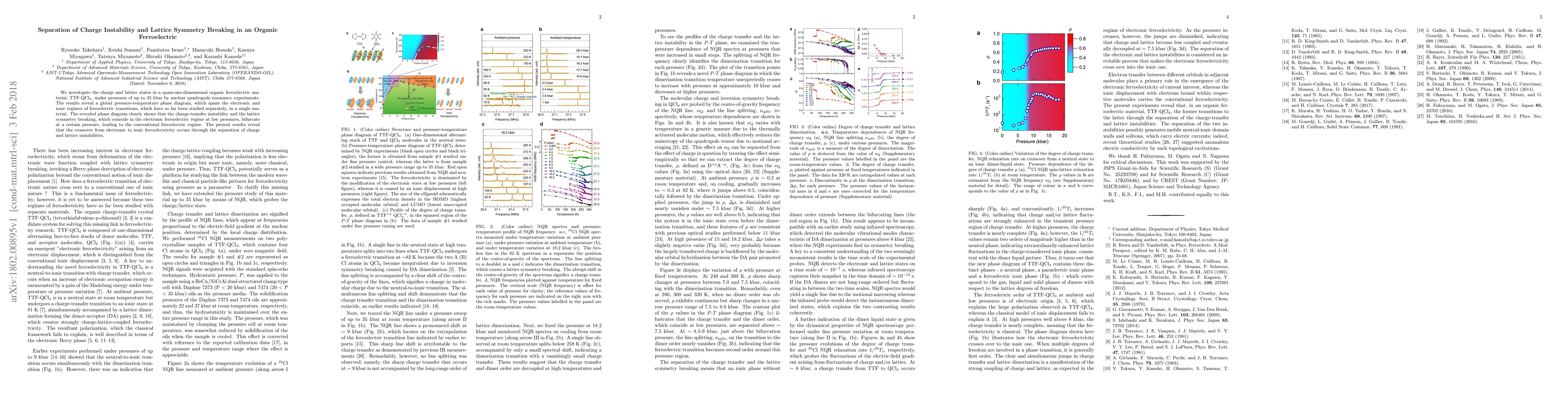 This study uses nuclear quadrupole resonance to explore the charge and lattice states in TTF-QCl$_{4}$ under high pressure, revealing a phase diagram showing the separation of charge-transfer instability and lattice symmetry breaking, indicating a transition from electronic to ionic ferroelectricity.