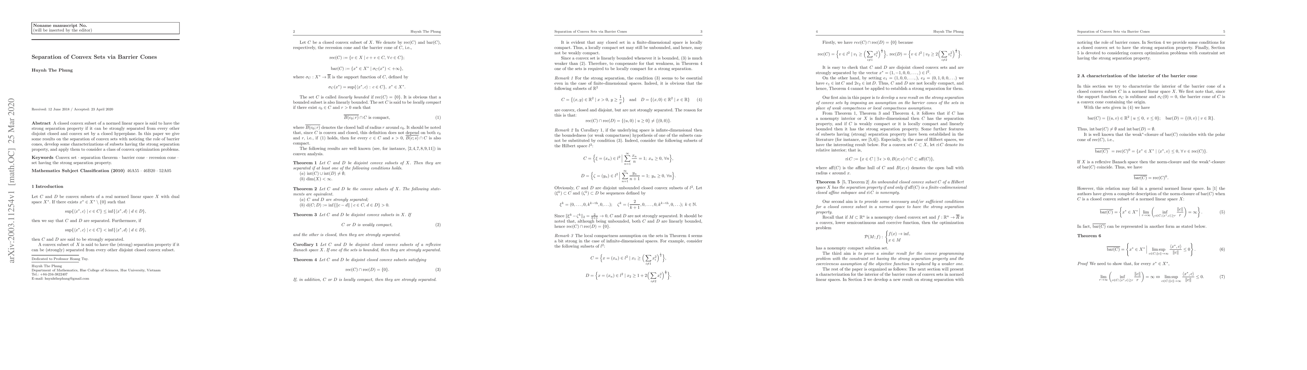 This paper explores how to separate convex sets using barrier cones, developing characterizations of subsets with strong separation properties and applying them to optimization problems.