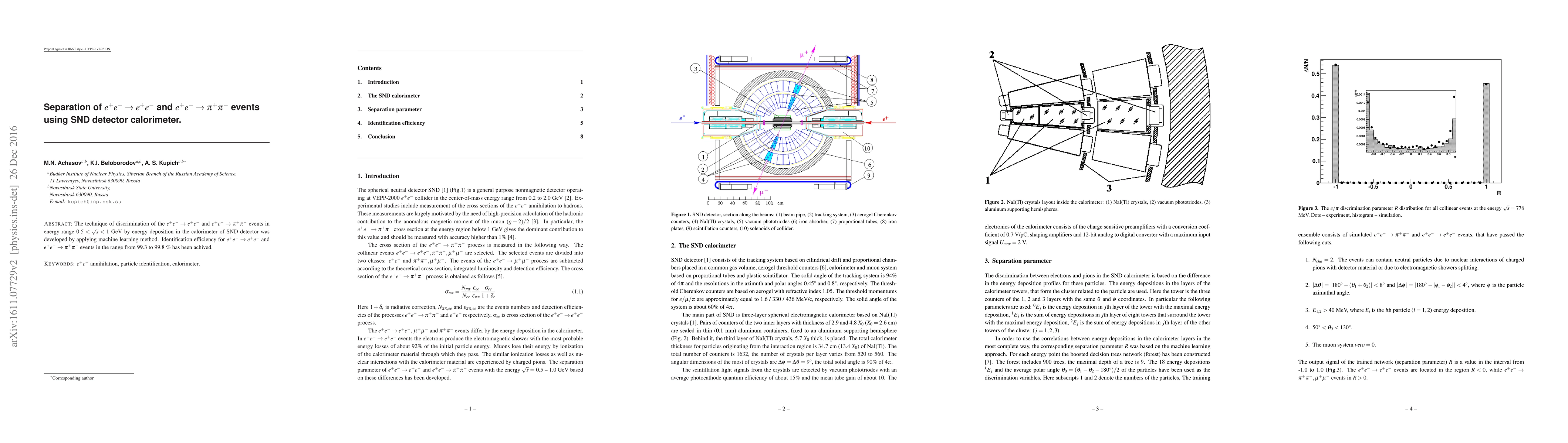This paper presents a machine learning method for distinguishing between $e^+e^-\to e^+e^-$ and $e^+e^-\to\pi^+\pi^-$ events using the SND detector calorimeter, achieving identification efficiencies of 99.3-99.8%. The technique relies on energy deposition patterns in the calorimeter.
