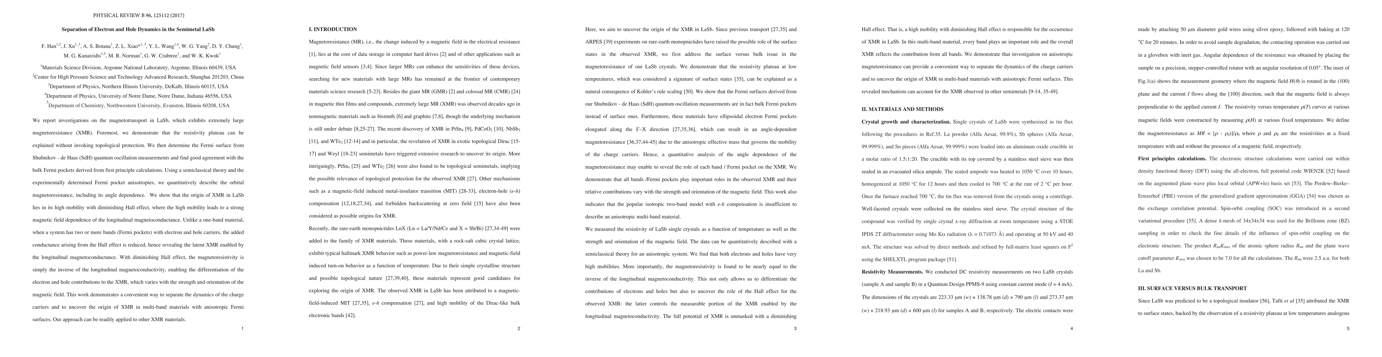 The paper presents a comprehensive analysis of the magnetotransport properties in LaSb, separating electron and hole dynamics using a semiclassical theory and first-principle calculations, and demonstrating that high mobility with diminishing Hall effect is the origin of XMR.