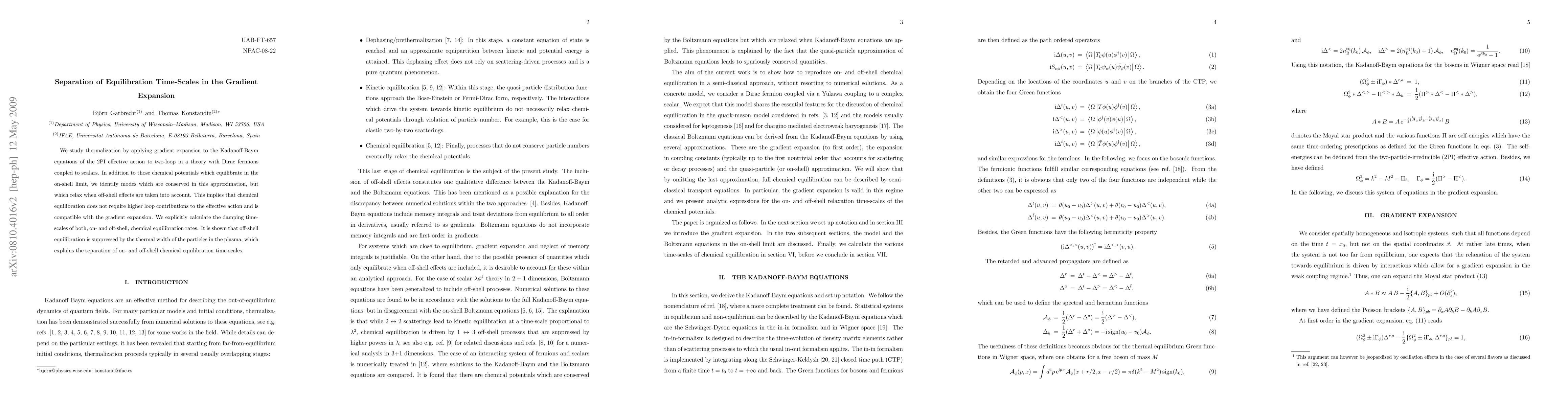 This paper investigates thermalization using gradient expansion on the Kadanoff-Baym equations, identifying conserved modes that relax with off-shell effects. It concludes that chemical equilibration can occur without higher loop contributions, with distinct time-scales for on- and off-shell equilibration, the latter being suppressed by thermal widths.