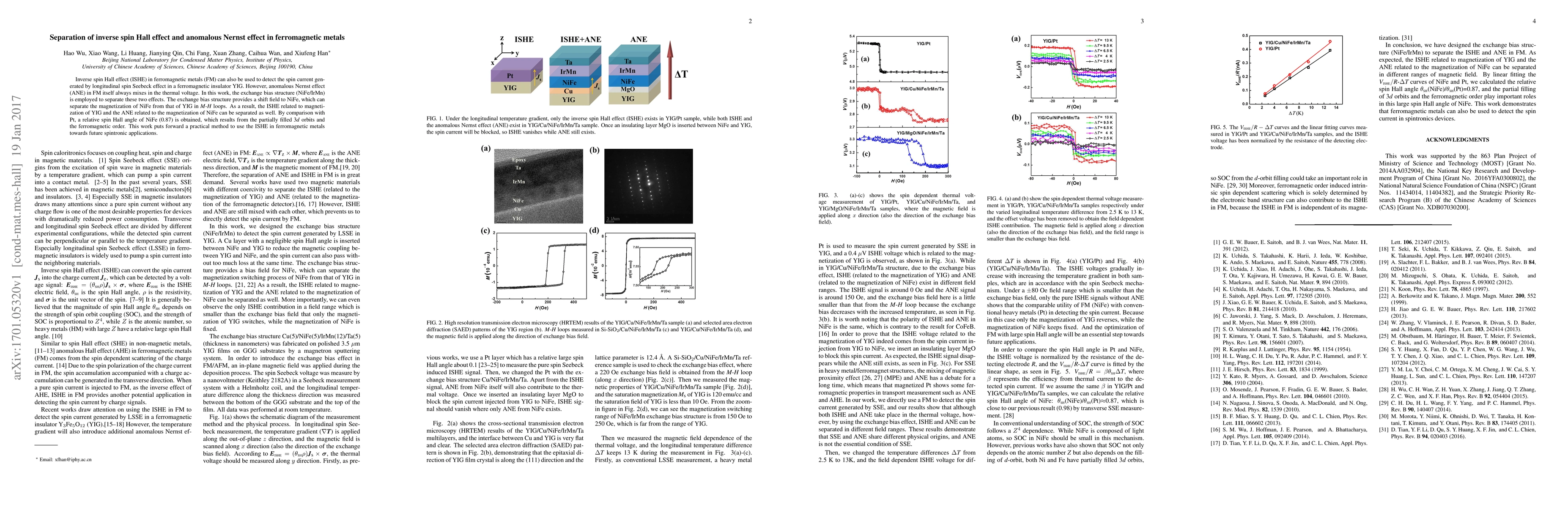 This study separates the inverse spin Hall effect (ISHE) from the anomalous Nernst effect (ANE) in ferromagnetic metals using an exchange bias structure (NiFe/IrMn), allowing for clearer detection of spin currents generated by the longitudinal spin Seebeck effect. The method results in a relative spin Hall angle of 0.87 for NiFe, aiding future spintronic applications.