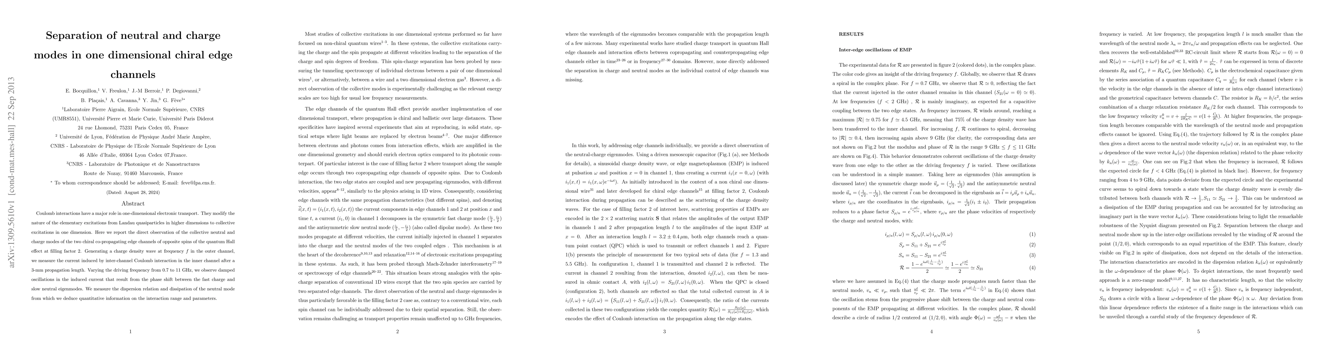 Coulomb interactions have a major role in one-dimensional electronic transport. They modify the nature of the elementary excitations from Landau quasiparticles in higher dimensions to collective excitations in one dimension. Here we report the direct observation of the collective neutral and charge modes of the two chiral co-propagating edge channels of opposite spins of the quantum Hall effect at filling factor 2. Generating a charge density wave at frequency f in the outer channel, we measure the current induced by inter-channel Coulomb interaction in the inner channel after a 3-mm propagation length. Varying the driving frequency from 0.7 to 11 GHz, we observe damped oscillations in the induced current that result from the phase shift between the fast charge and slow neutral eigenmodes. We measure the dispersion relation and dissipation of the neutral mode from which we deduce quantitative information on the interaction range and parameters.