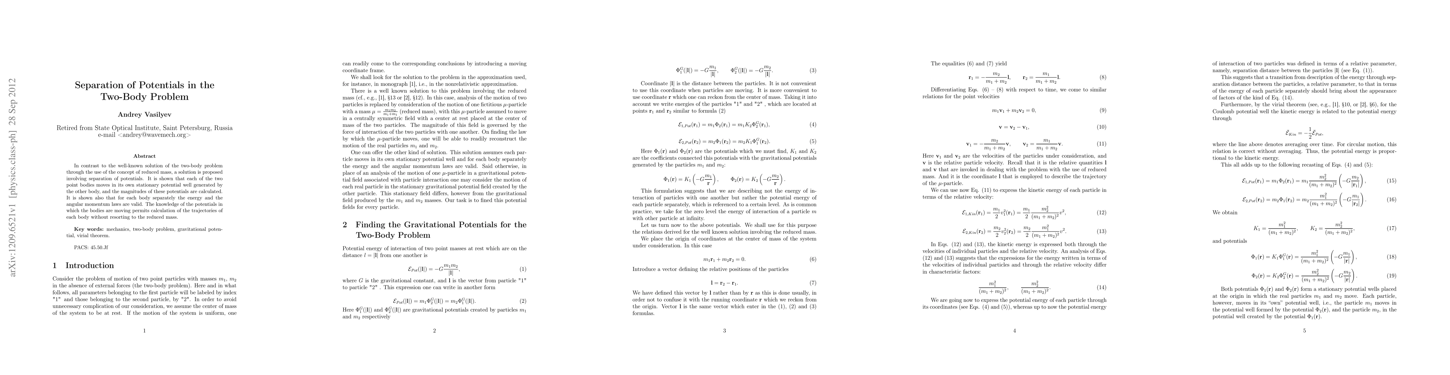 Researchers propose a new solution to the two-body problem by separating potentials, showing each body moves in its own stationary potential well generated by the other, without using reduced mass.