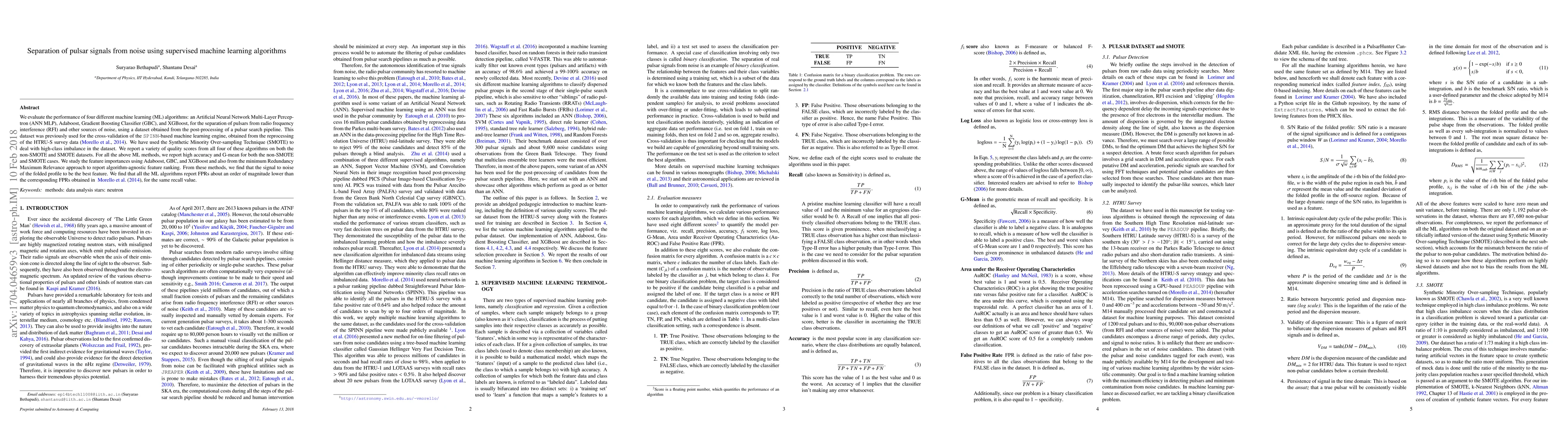 We evaluate the performance of four different machine learning (ML) algorithms: an Artificial Neural Network Multi-Layer Perceptron (ANN MLP ), Adaboost, Gradient Boosting Classifier (GBC), XGBoost, for the separation of pulsars from radio frequency interference (RFI) and other sources of noise, using a dataset obtained from the post-processing of a pulsar search pi peline. This dataset was previously used for cross-validation of the SPINN-based machine learning engine, used for the reprocessing of HTRU-S survey data arXiv:1406.3627. We have used Synthetic Minority Over-sampling Technique (SMOTE) to deal with high class imbalance in the dataset. We report a variety of quality scores from all four of these algorithms on both the non-SMOTE and SMOTE datasets. For all the above ML methods, we report high accuracy and G-mean in both the non-SMOTE and SMOTE cases. We study the feature importances using Adaboost, GBC, and XGBoost and also from the minimum Redundancy Maximum Relevance approach to report algorithm-agnostic feature ranking. From these methods, we find that the signal to noise of the folded profile to be the best feature. We find that all the ML algorithms report FPRs about an order of magnitude lower than the corresponding FPRs obtained in arXiv:1406.3627, for the same recall value.