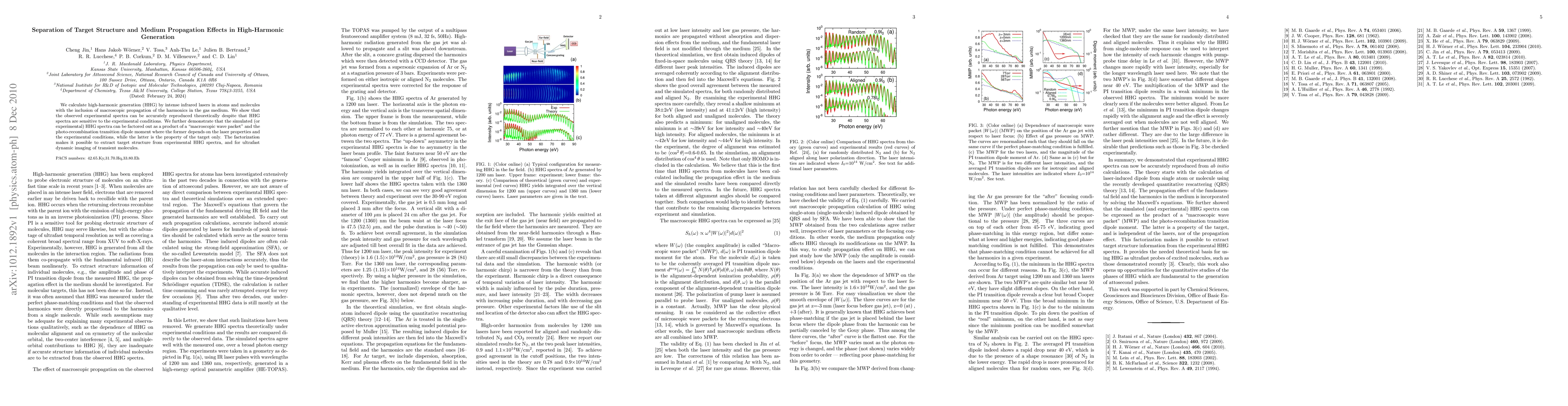 We calculate high-harmonic generation (HHG) by intense infrared lasers in atoms and molecules with the inclusion of macroscopic propagation of the harmonics in the gas medium. We show that the observed experimental spectra can be accurately reproduced theoretically despite that HHG spectra are sensitive to the experimental conditions. We further demonstrate that the simulated (or experimental) HHG spectra can be factored out as a product of a \macroscopic wave packet" and the photo-recombination transition dipole moment where the former depends on the laser properties and the experimental conditions, while the latter is the property of the target only. The factorization makes it possible to extract target structure from experimental HHG spectra, and for ultrafast dynamic imaging of transient molecules.