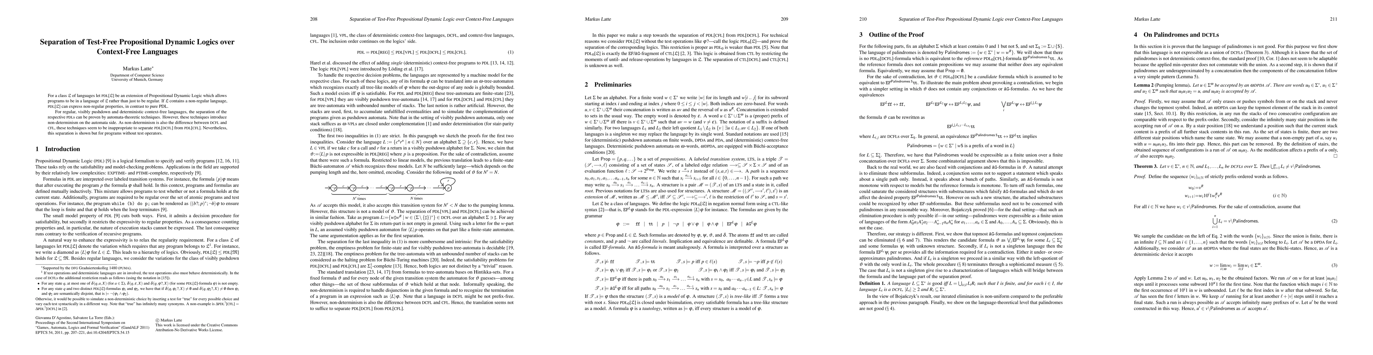 For a class L of languages let PDL[L] be an extension of Propositional Dynamic Logic which allows programs to be in a language of L rather than just to be regular. If L contains a non-regular language, PDL[L] can express non-regular properties, in contrast to pure PDL. For regular, visibly pushdown and deterministic context-free languages, the separation of the respective PDLs can be proven by automata-theoretic techniques. However, these techniques introduce non-determinism on the automata side. As non-determinism is also the difference between DCFL and CFL, these techniques seem to be inappropriate to separate PDL[DCFL] from PDL[CFL]. Nevertheless, this separation is shown but for programs without test operators.