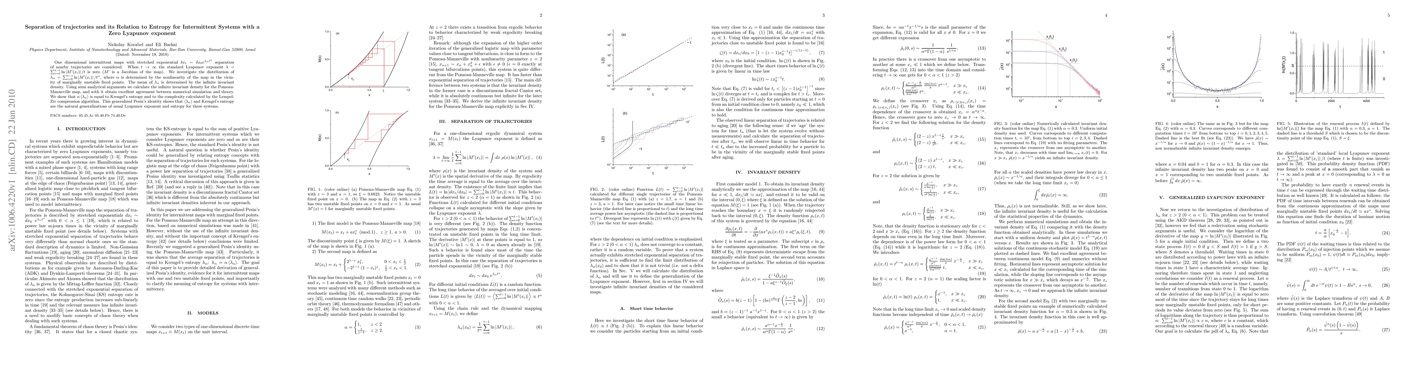 One dimensional intermittent maps with stretched exponential separation of nearby trajectories are considered. When time goes infinity the standard Lyapunov exponent is zero. We investigate the distribution of $\lambda_{\alpha}= \sum_{i=0}^{t-1} \ln \left| M'(x_i) \right|/t^{\alpha}$, where $\alpha$ is determined by the nonlinearity of the map in the vicinity of marginally unstable fixed points. The mean of $\lambda_{\alpha}$ is determined by the infinite invariant density. Using semi analytical arguments we calculate the infinite invariant density for the Pomeau-Manneville map, and with it obtain excellent agreement between numerical simulation and theory. We show that $\alpha \left< \lambda_{\alpha}\right>$ is equal to Krengel's entropy and to the complexity calculated by the Lempel-Ziv compression algorithm. This generalized Pesin's identity shows that $\left< \lambda_{\alpha}\right>$ and Krengel's entropy are the natural generalizations of usual Lyapunov exponent and entropy for these systems.