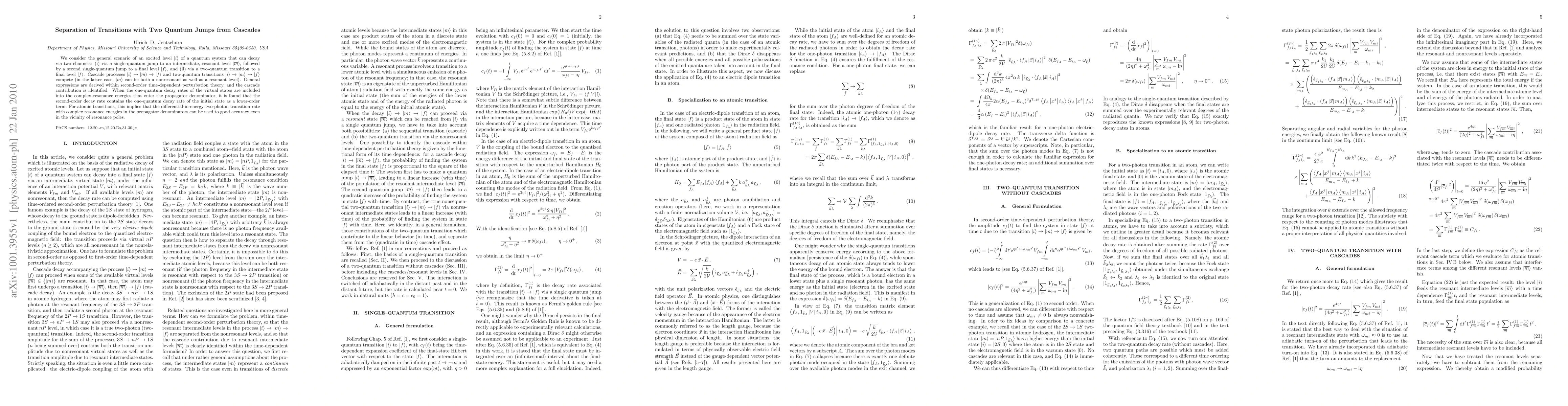 We consider the general scenario of an excited level |i> of a quantum system that can decay via two channels: (i) via a single-quantum jump to an intermediate, resonant level |bar m>, followed by a second single-quantum jump to a final level |f>, and (ii) via a two-quantum transition to a final level |f>. Cascade processes |i> -> |bar m> -> | f> and two-quantum transitions |i> -> |m> -> |f> compete (in the latter case, |m> can be both a nonresonant as well as a resonant level). General expressions are derived within second-order time-dependent perturbation theory, and the cascade contribution is identified. When the one-quantum decay rates of the virtual states are included into the complex resonance energies that enter the propagator denominator, it is found that the second-order decay rate contains the one-quantum decay rate of the initial state as a lower-order term. For atomic transitions, this implies that the differential-in-energy two-photon transition rate with complex resonance energies in the propagator denominators can be used to good accuracy even in the vicinity of resonance poles.