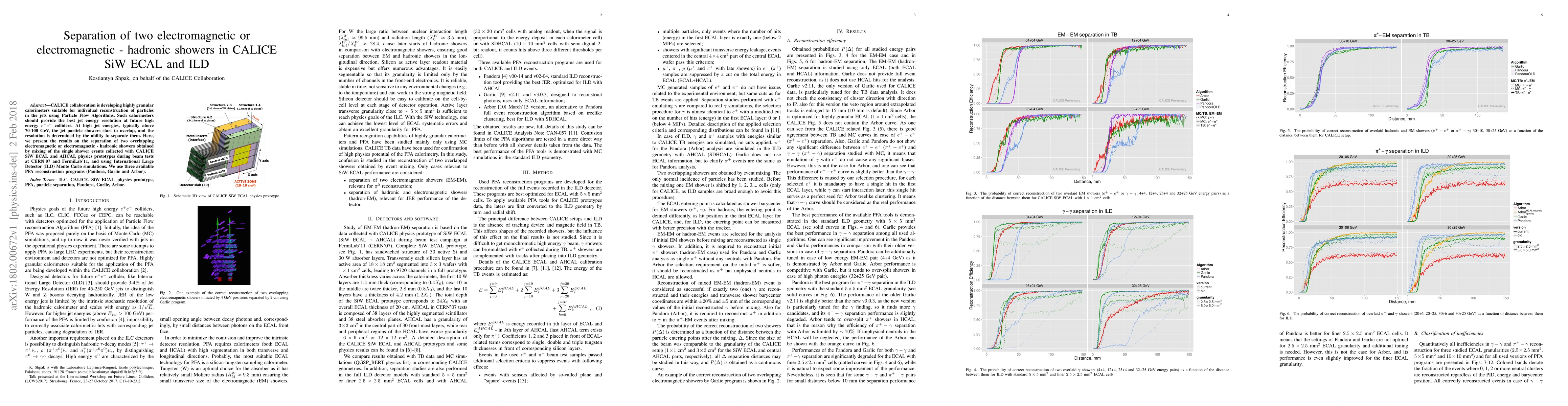 CALICE collaboration is developing highly granular calorimeters suitable for individual reconstruction of particles in the jets using Particle Flow Algorithms. Such calorimeters should provide the best jet energy resolution at future high energy $e^{+}e^{-}$ colliders. At high jet energies, typically above 70-100 GeV, the jet particle showers start to overlap, and the resolution is determined by the ability to separate them. Here, we present the results on the separation of two overlapping electromagnetic or electromagnetic - hadronic showers obtained by mixing of the single shower events collected with CALICE SiW ECAL and AHCAL physics prototypes during beam tests at CERN'07 and FermiLab'11, and using International Large Detector (ILD) Monte Carlo simulations. We use three available PFA reconstruction programs (Pandora, Garlic and Arbor).