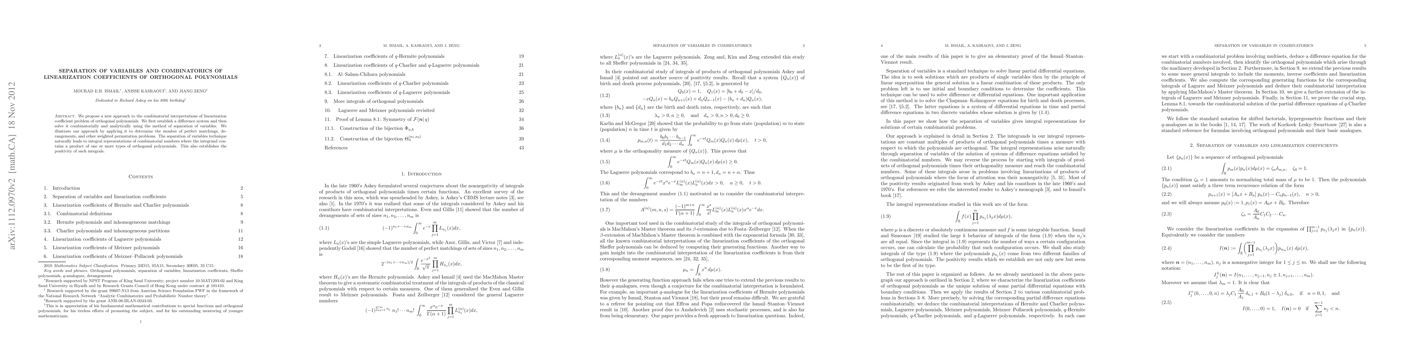 We propose a new approach to the combinatorial interpretations of linearization coefficient problem of orthogonal polynomials. We first establish a difference system and then solve it combinatorially and analytically using the method of separation of variables. We illustrate our approach by applying it to determine the number of perfect matchings, derangements, and other weighted permutation problems. The separation of variables technique naturally leads to integral representations of combinatorial numbers where the integrand contains a product of one or more types of orthogonal polynomials. This also establishes the positivity of such integrals.