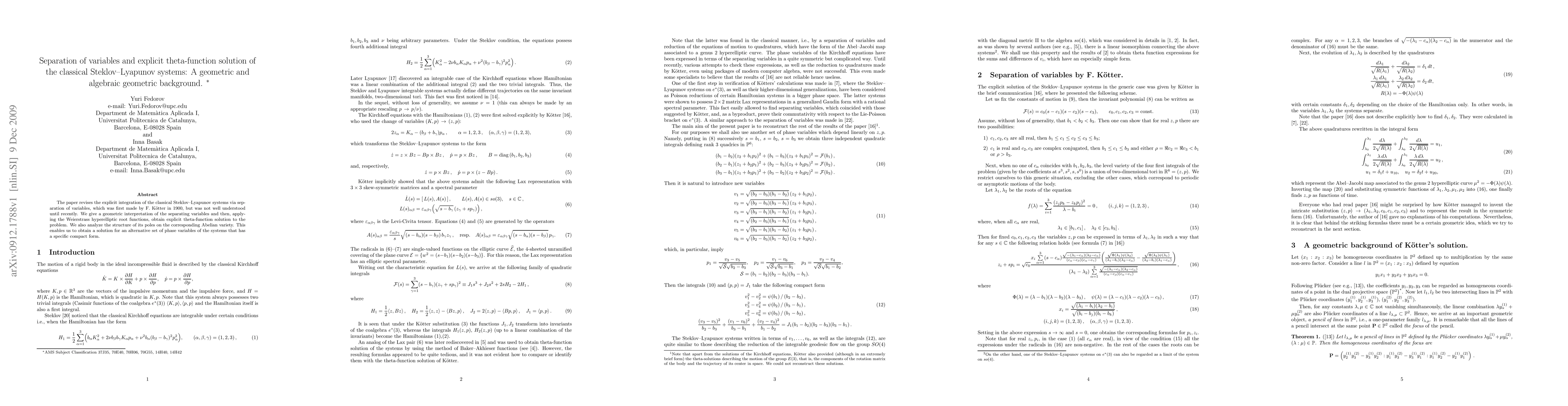 The paper revises the explicit integration of the classical Steklov--Lyapunov systems via separation of variables, which was first made by F. K\"otter in 1900, but was not well understood until recently. We give a geometric interpretation of the separating variables and then, applying the Weierstrass hyperelliptic root functions, obtain explicit theta-function solution to the problem. We also analyze the structure of its poles on the corresponding Abelian variety. This enables us to obtain a solution for an alternative set of phase variables of the systems that has a specific compact form.