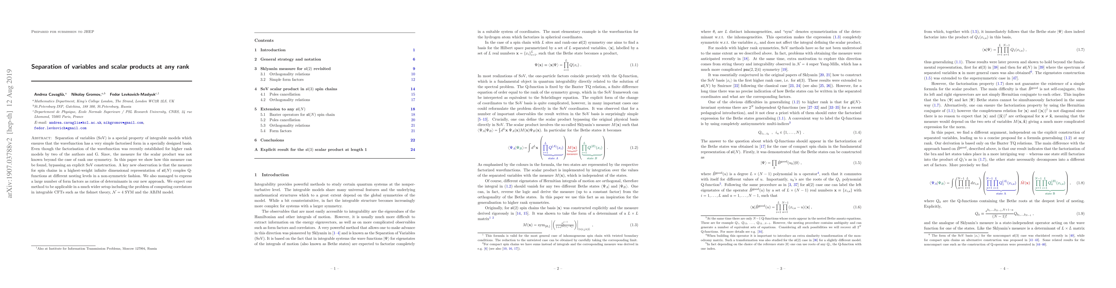 Separation of variables (SoV) is a special property of integrable models which ensures that the wavefunction has a very simple factorised form in a specially designed basis. Even though the factorisation of the wavefunction was recently established for higher rank models by two of the authors and G. Sizov, the measure for the scalar product was not known beyond the case of rank one symmetry. In this paper we show how this measure can be found, bypassing an explicit SoV construction. A key new observation is that the measure for spin chains in a highest-weight infinite dimensional representation of sl(N) couples Q-functions at different nesting levels in a non-symmetric fashion. We also managed to express a large number of form factors as ratios of determinants in our new approach. We expect our method to be applicable in a much wider setup including the problem of computing correlators in integrable CFTs such as the fishnet theory, N=4 SYM and the ABJM model.