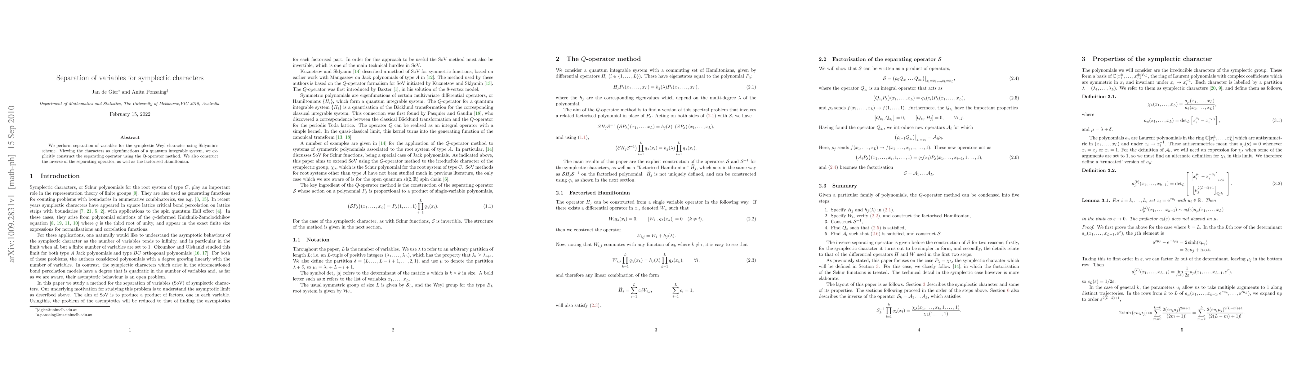 This paper applies Sklyanin's separation of variables scheme to symplectic Weyl characters, constructing the separating operator via the Q-operator method and deriving the inverse and factorised Hamiltonian for a quantum integrable system.