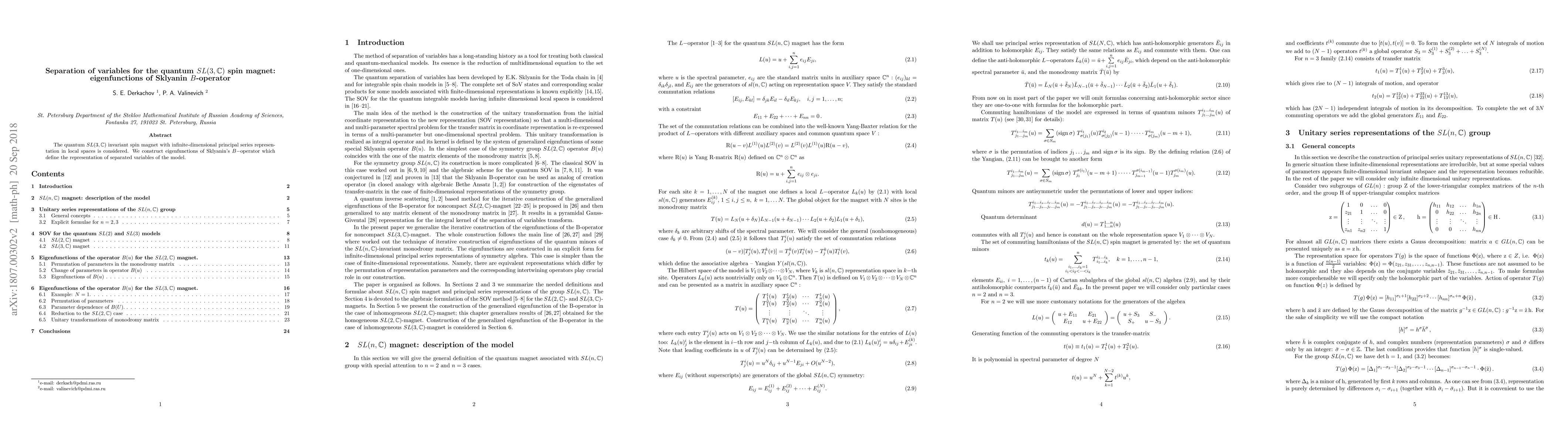 The quantum SL(3,C) invariant spin magnet with infinite-dimensional principal series representation in local spaces is considered. We construct eigenfunctions of Sklyanin B-operator which define the representation of separated variables of the model.