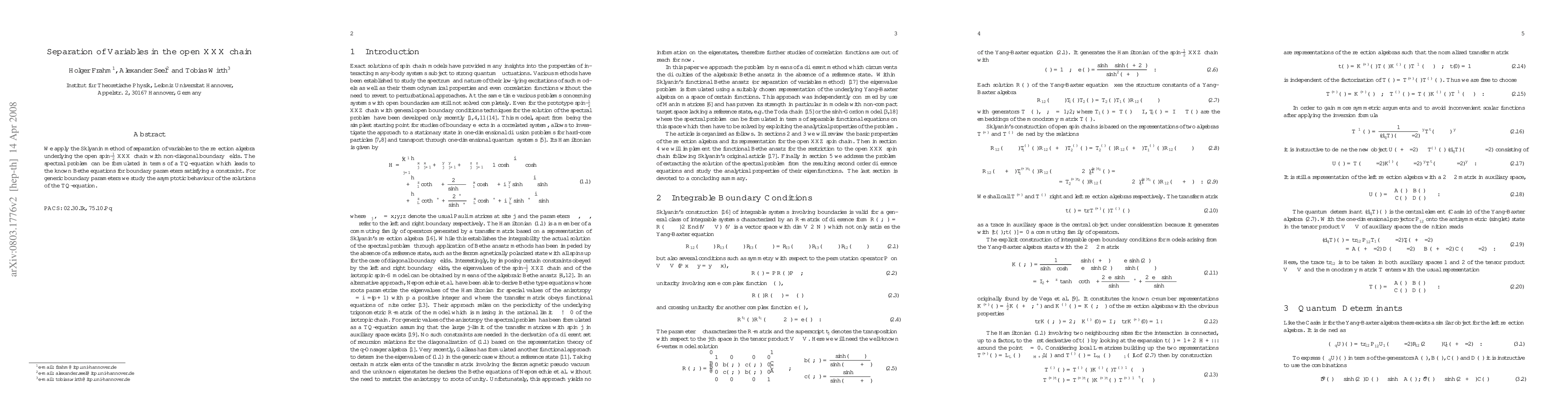 The paper applies Sklyanin's separation of variables method to the open spin-1/2 XXX chain, formulating the spectral problem via a TQ-equation that reduces to known Bethe equations under specific boundary constraints, and examines the asymptotic behavior of TQ-equation solutions for general boundary parameters.
