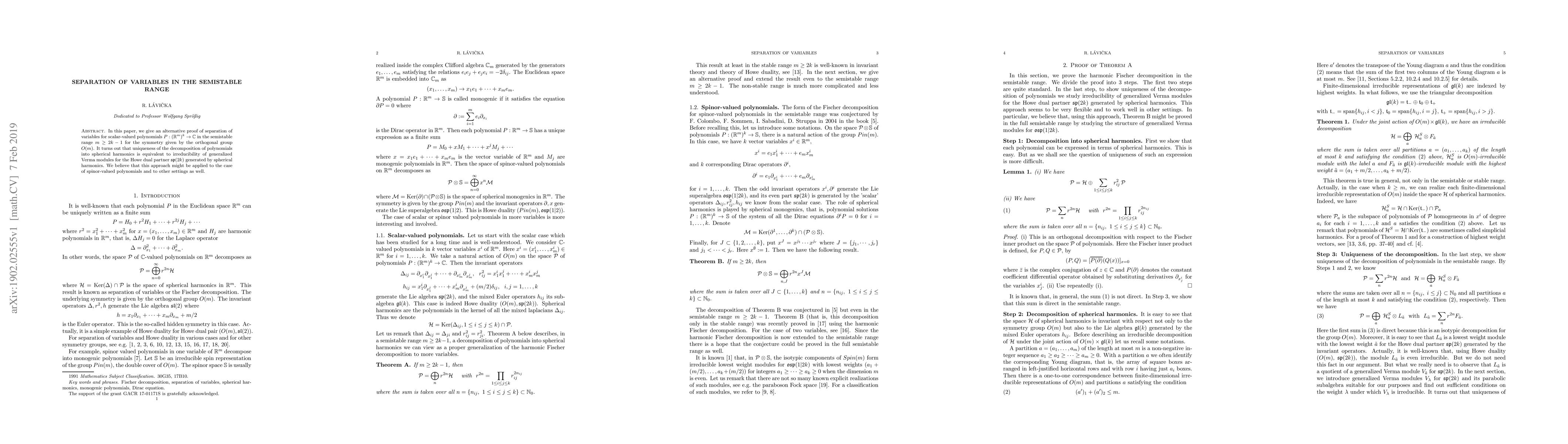 In this paper, we give an alternative proof of separation of variables for scalar-valued polynomials $P:(\mathbb R^m)^k\to\mathbb C$ in the semistable range $m\geq 2k-1$ for the symmetry given by the orthogonal group $O(m)$. It turns out that uniqueness of the decomposition of polynomials into spherical harmonics is equivalent to irreducibility of generalized Verma modules for the Howe dual partner $sp(2k)$ generated by spherical harmonics. We believe that this approach might be applied to the case of spinor-valued polynomials and to other settings as well.
