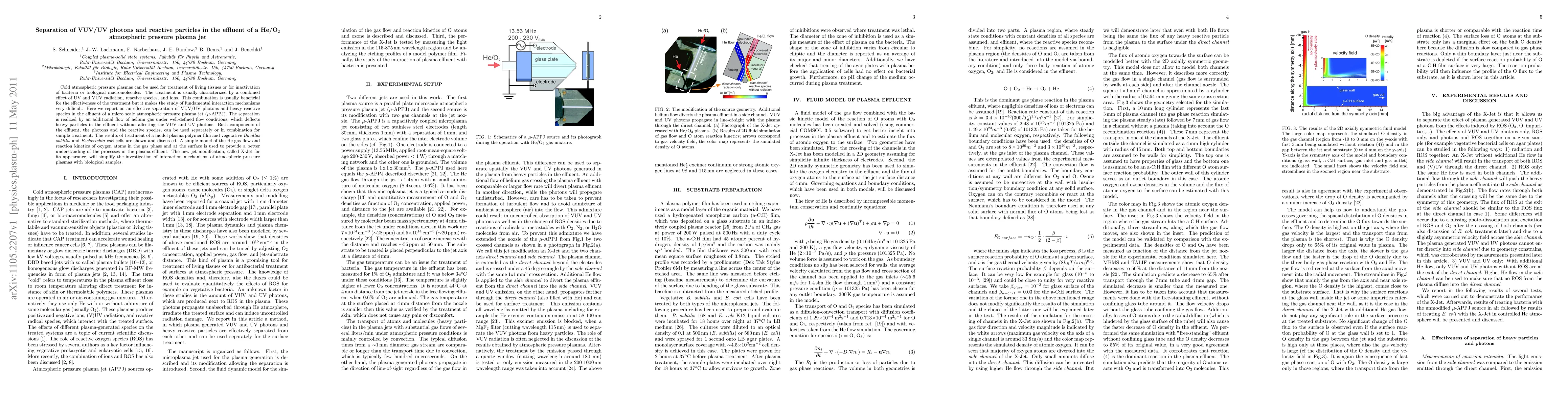 This paper reports on the separation of VUV/UV photons and reactive particles in a micro scale atmospheric pressure plasma jet, achieved by an additional helium gas flow, allowing independent use or combination for sample treatment. The X-Jet modification facilitates the study of plasma-biological interactions, demonstrated through treatment of plasma polymer films and bacterial cells.