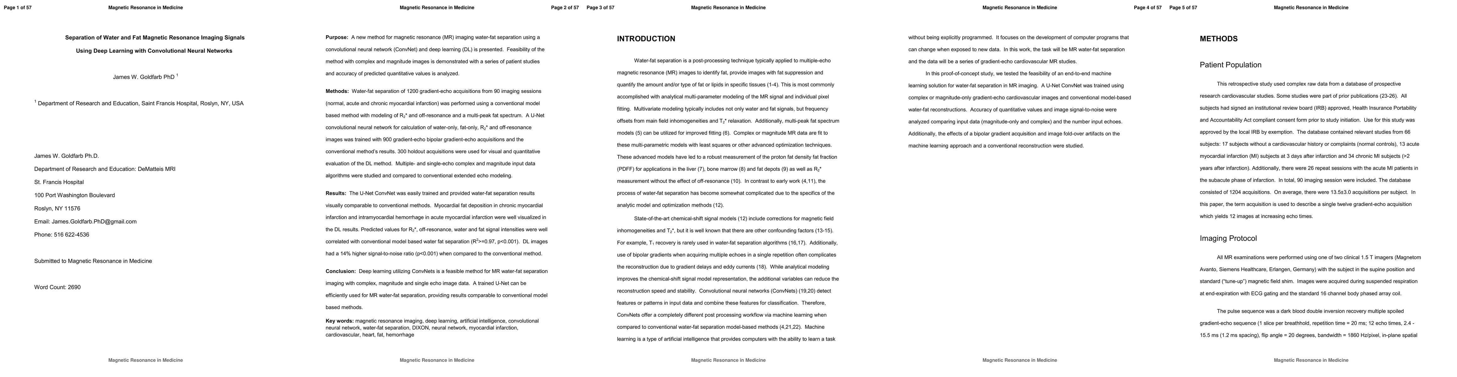 Purpose: A new method for magnetic resonance (MR) imaging water-fat separation using a convolutional neural network (ConvNet) and deep learning (DL) is presented. Feasibility of the method with complex and magnitude images is demonstrated with a series of patient studies and accuracy of predicted quantitative values is analyzed. Methods: Water-fat separation of 1200 gradient-echo acquisitions from 90 imaging sessions (normal, acute and chronic myocardial infarction) was performed using a conventional model based method with modeling of R2* and off-resonance and a multi-peak fat spectrum. A U-Net convolutional neural network for calculation of water-only, fat-only, R2* and off-resonance images was trained with 900 gradient-echo Multiple and single-echo complex and magnitude input data algorithms were studied and compared to conventional extended echo modeling. Results: The U-Net ConvNet was easily trained and provided water-fat separation results visually comparable to conventional methods. Myocardial fat deposition in chronic myocardial infarction and intramyocardial hemorrhage in acute myocardial infarction were well visualized in the DL results. Predicted values for R2*, off-resonance, water and fat signal intensities were well correlated with conventional model based water fat separation (R2>=0.97, p<0.001). DL images had a 14% higher signal-to-noise ratio (p<0.001) when compared to the conventional method. Conclusion: Deep learning utilizing ConvNets is a feasible method for MR water-fat separationimaging with complex, magnitude and single echo image data. A trained U-Net can be efficiently used for MR water-fat separation, providing results comparable to conventional model based methods.