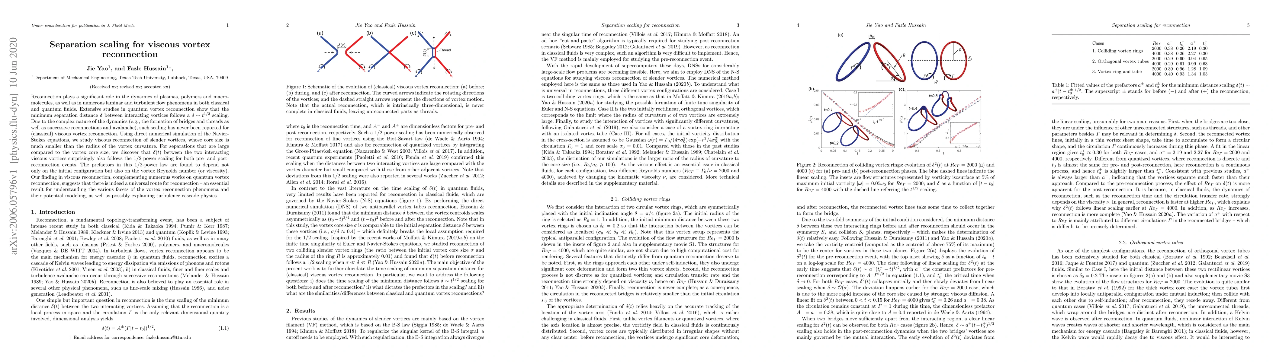 This paper investigates viscous vortex reconnection using direct numerical simulations of the Navier-Stokes equations, revealing that the separation distance between interacting vortices follows a 1/2 power scaling, similar to quantum vortex reconnection. The study finds that this scaling applies to both pre- and post-reconnection events, suggesting a universal route for reconnection.