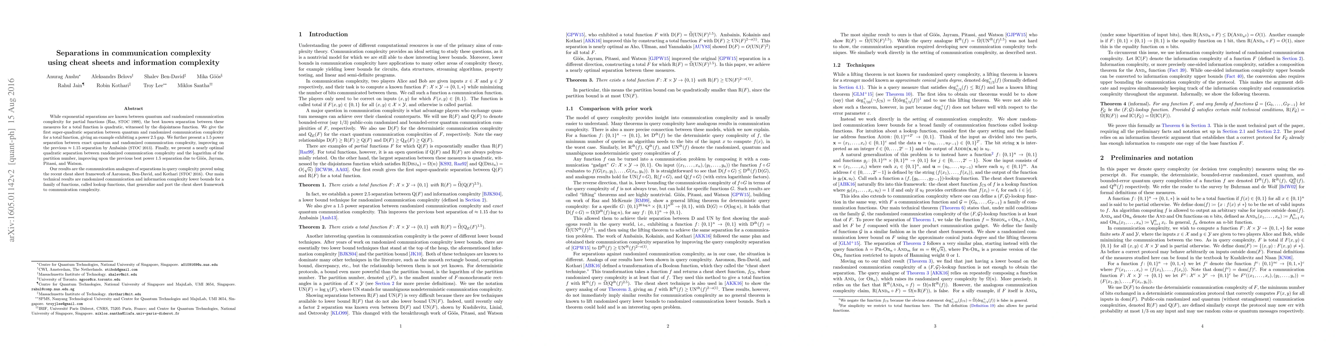 While exponential separations are known between quantum and randomized communication complexity for partial functions (Raz, STOC 1999), the best known separation between these measures for a total function is quadratic, witnessed by the disjointness function. We give the first super-quadratic separation between quantum and randomized communication complexity for a total function, giving an example exhibiting a power 2.5 gap. We further present a 1.5 power separation between exact quantum and randomized communication complexity, improving on the previous ~1.15 separation by Ambainis (STOC 2013). Finally, we present a nearly optimal quadratic separation between randomized communication complexity and the logarithm of the partition number, improving upon the previous best power 1.5 separation due to G\"o\"os, Jayram, Pitassi, and Watson. Our results are the communication analogues of separations in query complexity proved using the recent cheat sheet framework of Aaronson, Ben-David, and Kothari (STOC 2016). Our main technical results are randomized communication and information complexity lower bounds for a family of functions, called lookup functions, that generalize and port the cheat sheet framework to communication complexity.