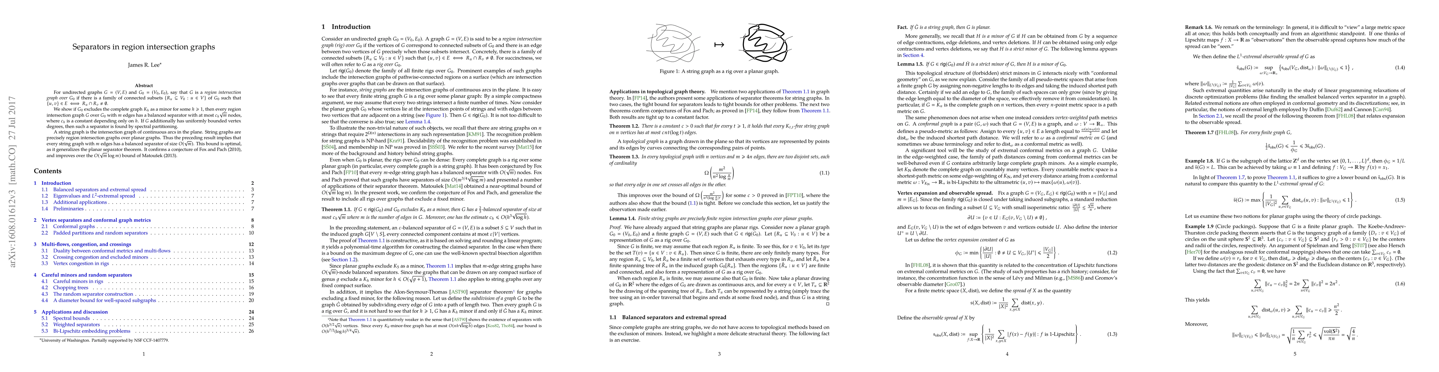 For undirected graphs $G=(V,E)$ and $G_0=(V_0,E_0)$, say that $G$ is a region intersection graph over $G_0$ if there is a family of connected subsets $\{ R_u \subseteq V_0 : u \in V \}$ of $G_0$ such that $\{u,v\} \in E \iff R_u \cap R_v \neq \emptyset$. We show if $G_0$ excludes the complete graph $K_h$ as a minor for some $h \geq 1$, then every region intersection graph $G$ over $G_0$ with $m$ edges has a balanced separator with at most $c_h \sqrt{m}$ nodes, where $c_h$ is a constant depending only on $h$. If $G$ additionally has uniformly bounded vertex degrees, then such a separator is found by spectral partitioning. A string graph is the intersection graph of continuous arcs in the plane. The preceding result implies that every string graph with $m$ edges has a balanced separator of size $O(\sqrt{m})$. This bound is optimal, as it generalizes the planar separator theorem. It confirms a conjecture of Fox and Pach (2010), and improves over the $O(\sqrt{m} \log m)$ bound of Matousek (2013).