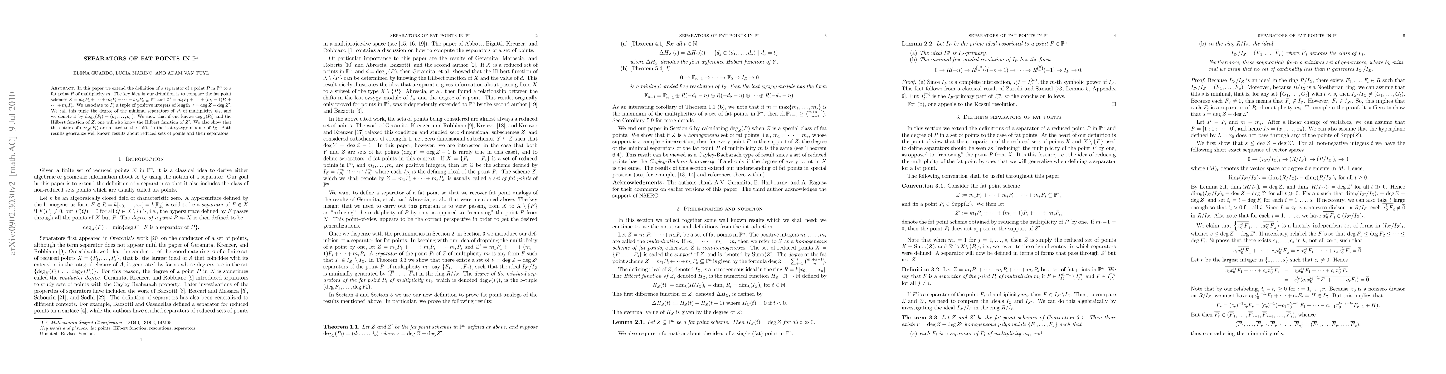 In this paper we extend the definition of a separator of a point P in P^n to a fat point P of multiplicity m. The key idea in our definition is to compare the fat point schemes Z = m_1P_1 + ... + m_iP_i + .... + m_sP_s in P^n and Z' = m_1P_1 + ... + (m_i-1)P_i + .... + m_sP_s. We associate to P_i a tuple of positive integers of length v = deg Z - deg Z'. We call this tuple the degree of the minimal separators of P_i of multiplicity m_i, and we denote it by deg_Z(P_i) = (d_1,...,d_v). We show that if one knows deg_Z(P_i) and the Hilbert function of Z, one will also know the Hilbert function of Z'. We also show that the entries of deg_Z(P_i) are related to the shifts in the last syzygy module of I_Z. Both results generalize well known results about reduced sets of points and their separators.