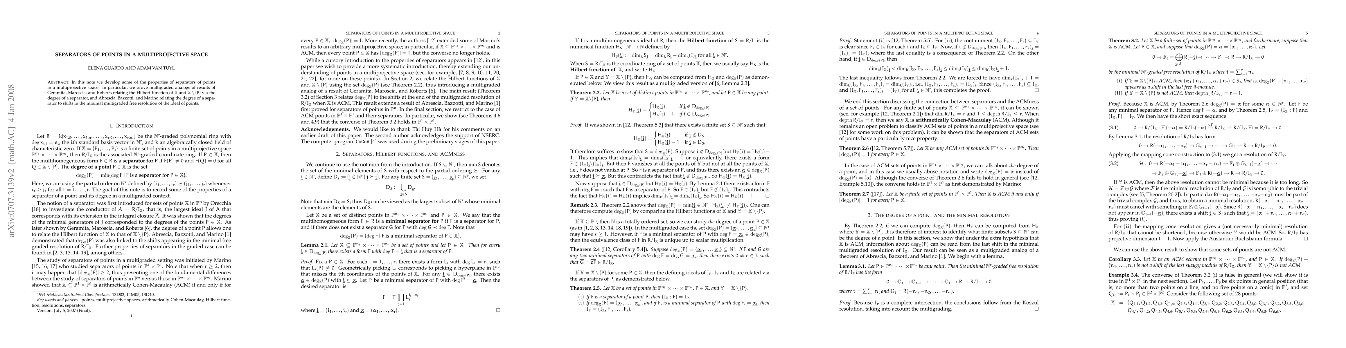 In this note we develop some of the properties of separators of points in a multiprojective space. In particular, we prove multigraded analogs of results of Geramita, Maroscia, and Roberts relating the Hilbert function of X and X \{P} via the degree of a separator, and Abrescia, Bazzotti, and Marino relating the degree of a separator to shifts in the minimal multigraded free resolution of the ideal of points.