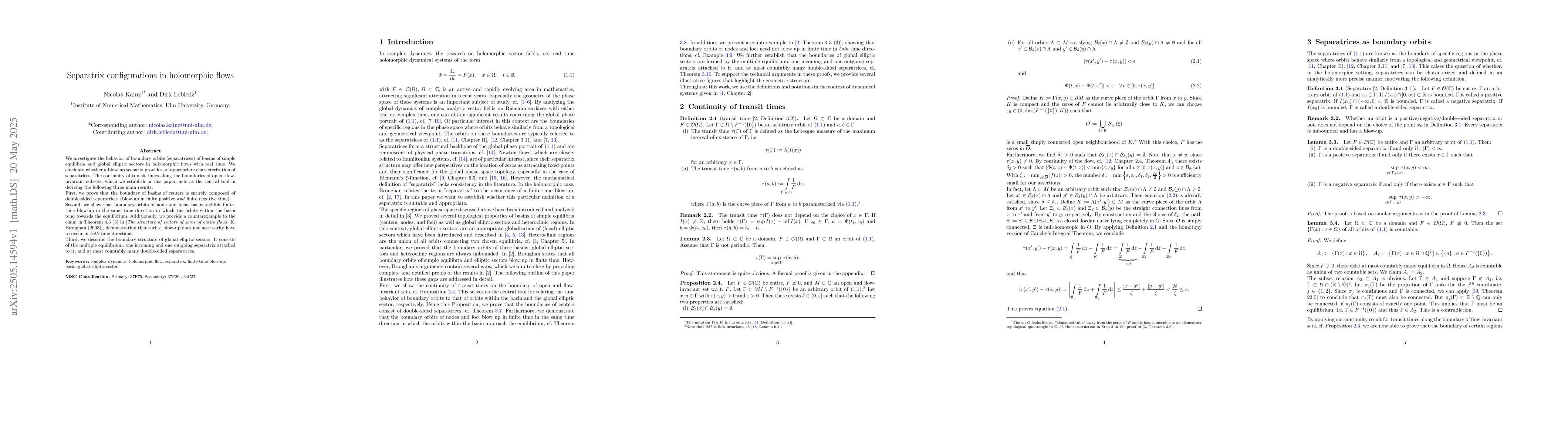 The paper provides a detailed analysis of the continuity of transit times along boundaries of open, flow-invariant subsets, leading to new insights on separatrix configurations in holomorphic flows.