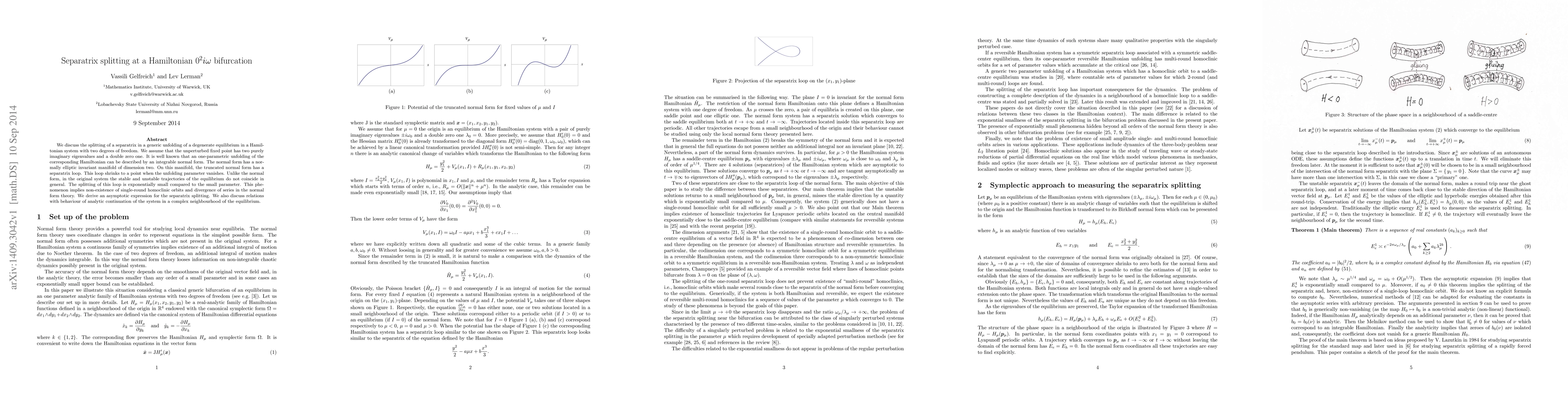 We discuss the splitting of a separatrix in a generic unfolding of a degenerate equilibrium in a Hamiltonian system with two degrees of freedom. We assume that the unperturbed fixed point has two purely imaginary eigenvalues and a double zero one. It is well known that an one-parametric unfolding of the corresponding Hamiltonian can be described by an integrable normal form. The normal form has a normally elliptic invariant manifold of dimension two. On this manifold, the truncated normal form has a separatrix loop. This loop shrinks to a point when the unfolding parameter vanishes. Unlike the normal form, in the original system the stable and unstable trajectories of the equilibrium do not coincide in general. The splitting of this loop is exponentially small compared to the small parameter. This phenomenon implies non-existence of single-round homoclinic orbits and divergence of series in the normal form theory. We derive an asymptotic expression for the separatrix splitting. We also discuss relations with behaviour of analytic continuation of the system in a complex neighbourhood of the equilibrium.