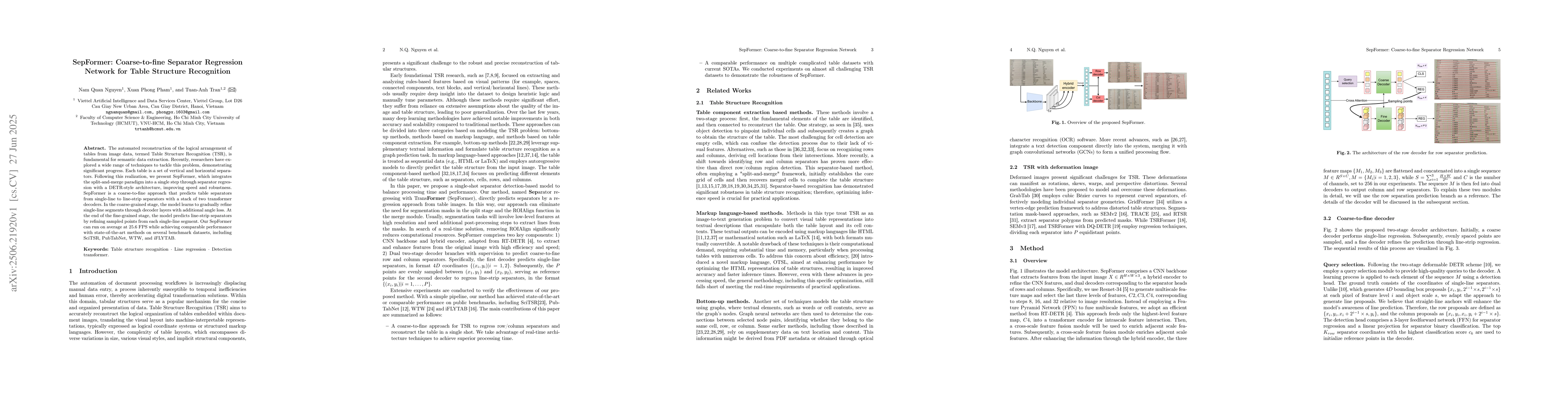 The automated reconstruction of the logical arrangement of tables from image data, termed Table Structure Recognition (TSR), is fundamental for semantic data extraction. Recently, researchers have explored a wide range of techniques to tackle this problem, demonstrating significant progress. Each table is a set of vertical and horizontal separators. Following this realization, we present SepFormer, which integrates the split-and-merge paradigm into a single step through separator regression with a DETR-style architecture, improving speed and robustness. SepFormer is a coarse-to-fine approach that predicts table separators from single-line to line-strip separators with a stack of two transformer decoders. In the coarse-grained stage, the model learns to gradually refine single-line segments through decoder layers with additional angle loss. At the end of the fine-grained stage, the model predicts line-strip separators by refining sampled points from each single-line segment. Our SepFormer can run on average at 25.6 FPS while achieving comparable performance with state-of-the-art methods on several benchmark datasets, including SciTSR, PubTabNet, WTW, and iFLYTAB.