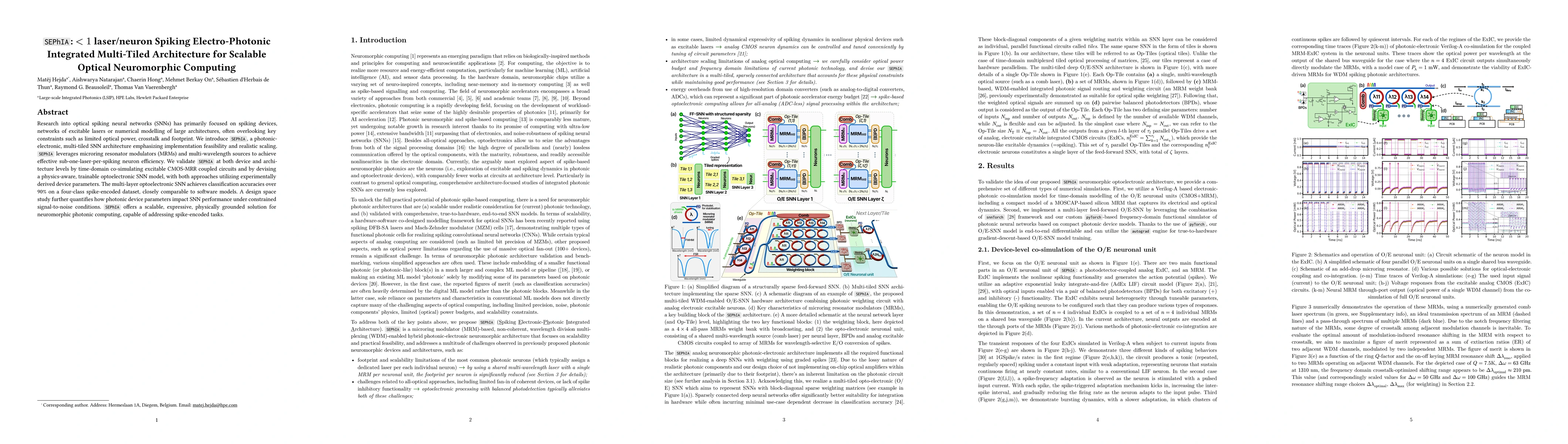 Research into optical spiking neural networks (SNNs) has primarily focused on spiking devices, networks of excitable lasers or numerical modelling of large architectures, often overlooking key constraints such as limited optical power, crosstalk and footprint. We introduce SEPhIA, a photonic-electronic, multi-tiled SNN architecture emphasizing implementation feasibility and realistic scaling. SEPhIA leverages microring resonator modulators (MRMs) and multi-wavelength sources to achieve effective sub-one-laser-per-spiking neuron efficiency. We validate SEPhIA at both device and architecture levels by time-domain co-simulating excitable CMOS-MRR coupled circuits and by devising a physics-aware, trainable optoelectronic SNN model, with both approaches utilizing experimentally derived device parameters. The multi-layer optoelectronic SNN achieves classification accuracies over 90% on a four-class spike-encoded dataset, closely comparable to software models. A design space study further quantifies how photonic device parameters impact SNN performance under constrained signal-to-noise conditions. SEPhIA offers a scalable, expressive, physically grounded solution for neuromorphic photonic computing, capable of addressing spike-encoded tasks.