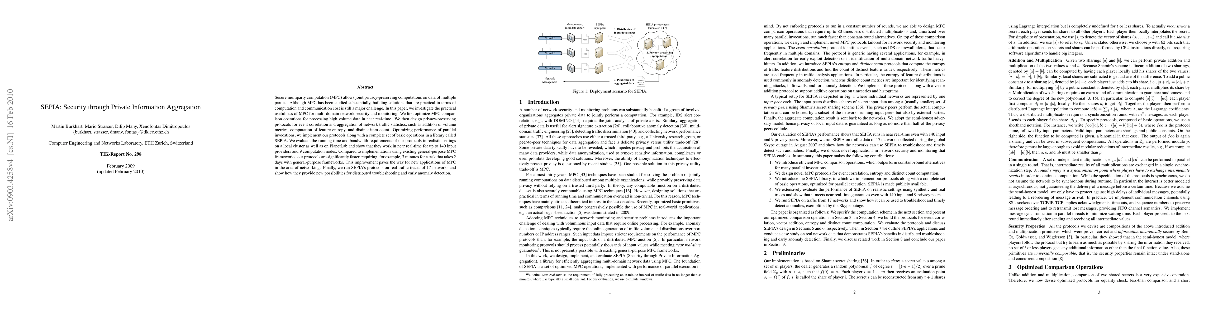 Secure multiparty computation (MPC) allows joint privacy-preserving computations on data of multiple parties. Although MPC has been studied substantially, building solutions that are practical in terms of computation and communication cost is still a major challenge. In this paper, we investigate the practical usefulness of MPC for multi-domain network security and monitoring. We first optimize MPC comparison operations for processing high volume data in near real-time. We then design privacy-preserving protocols for event correlation and aggregation of network traffic statistics, such as addition of volume metrics, computation of feature entropy, and distinct item count. Optimizing performance of parallel invocations, we implement our protocols along with a complete set of basic operations in a library called SEPIA. We evaluate the running time and bandwidth requirements of our protocols in realistic settings on a local cluster as well as on PlanetLab and show that they work in near real-time for up to 140 input providers and 9 computation nodes. Compared to implementations using existing general-purpose MPC frameworks, our protocols are significantly faster, requiring, for example, 3 minutes for a task that takes 2 days with general-purpose frameworks. This improvement paves the way for new applications of MPC in the area of networking. Finally, we run SEPIA's protocols on real traffic traces of 17 networks and show how they provide new possibilities for distributed troubleshooting and early anomaly detection.