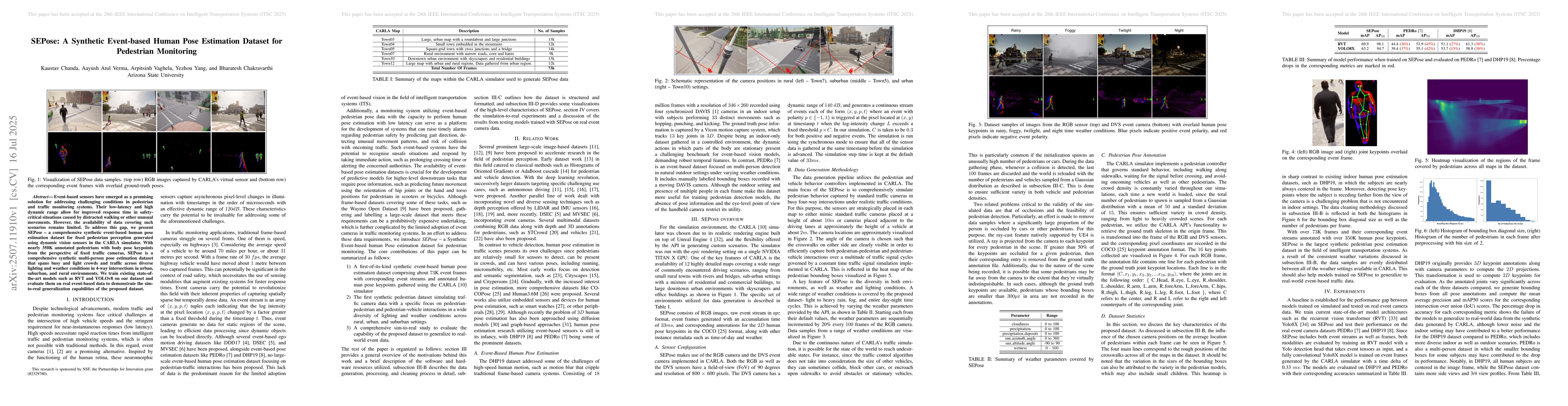 Event-based sensors have emerged as a promising solution for addressing challenging conditions in pedestrian and traffic monitoring systems. Their low-latency and high dynamic range allow for improved response time in safety-critical situations caused by distracted walking or other unusual movements. However, the availability of data covering such scenarios remains limited. To address this gap, we present SEPose -- a comprehensive synthetic event-based human pose estimation dataset for fixed pedestrian perception generated using dynamic vision sensors in the CARLA simulator. With nearly 350K annotated pedestrians with body pose keypoints from the perspective of fixed traffic cameras, SEPose is a comprehensive synthetic multi-person pose estimation dataset that spans busy and light crowds and traffic across diverse lighting and weather conditions in 4-way intersections in urban, suburban, and rural environments. We train existing state-of-the-art models such as RVT and YOLOv8 on our dataset and evaluate them on real event-based data to demonstrate the sim-to-real generalization capabilities of the proposed dataset.