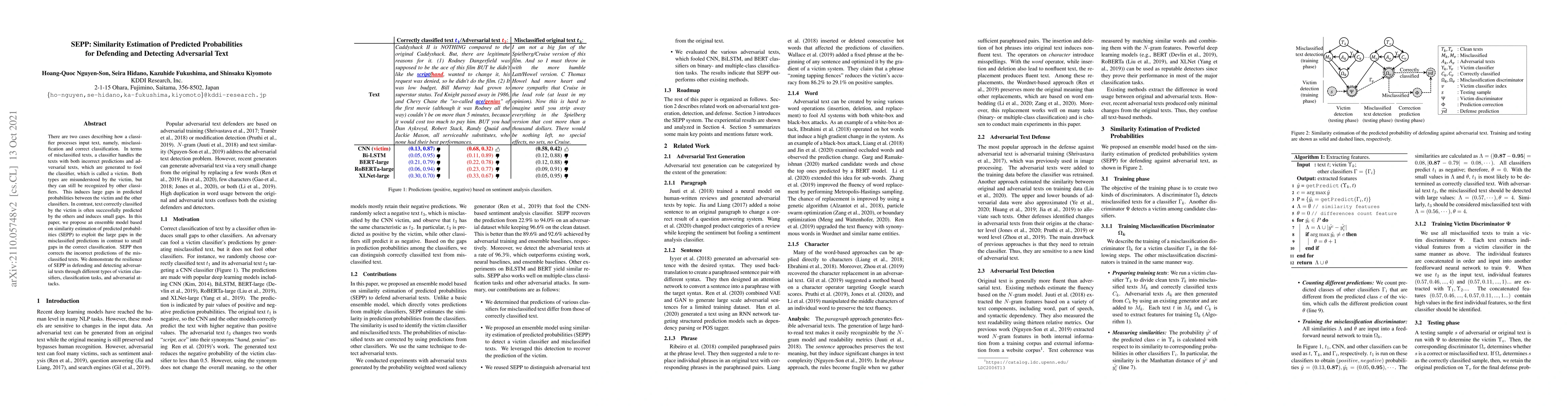This paper proposes SEPP, an ensemble model to defend against adversarial text by estimating the similarity of predicted probabilities between victim classifiers and others. SEPP leverages large gaps in misclassified predictions to correct errors and demonstrates effectiveness in defending and detecting adversarial attacks across various classifiers and tasks.
