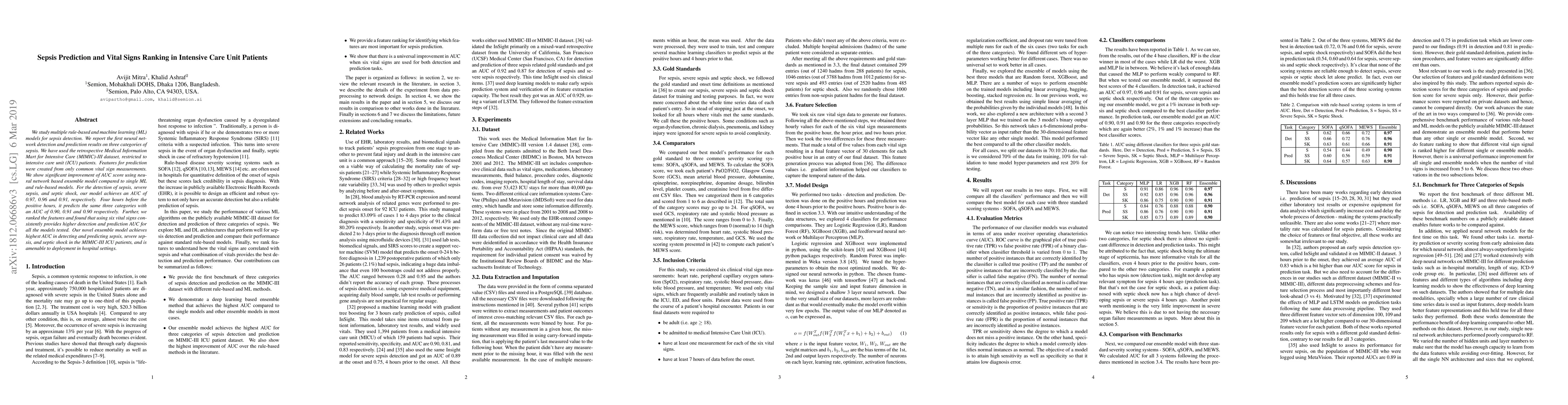 This study compares rule-based and machine learning models for sepsis detection using vital signs data from ICU patients in the MIMIC-III dataset. An ensemble neural network model significantly outperforms others, achieving AUC scores of 0.97, 0.96, and 0.91 for sepsis, severe sepsis, and septic shock, respectively, and demonstrating the importance of six vital signs for effective prediction.