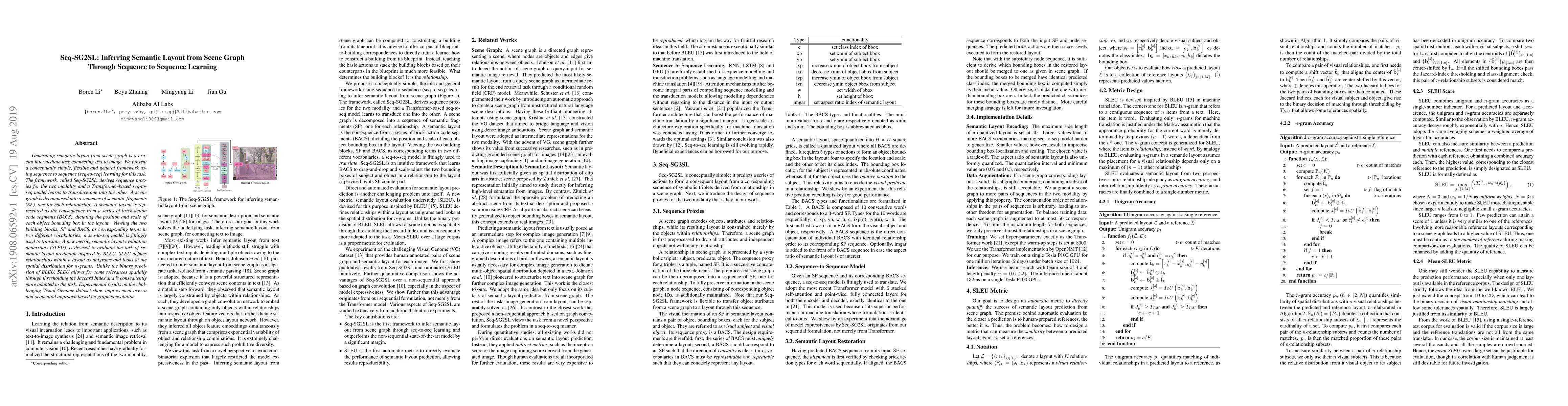Seq-SG2SL is a framework for inferring semantic layout from scene graphs using sequence-to-sequence learning, which translates scene graph fragments into brick-action code segments. A new evaluation metric, SLEU, is introduced to assess semantic layout prediction, showing improved performance over graph convolution-based methods on the Visual Genome dataset.