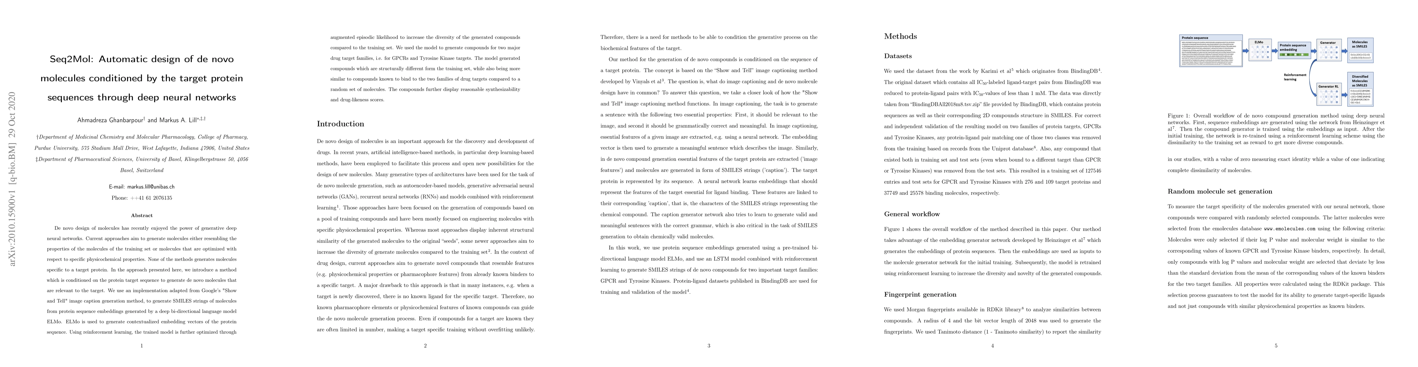 This paper introduces Seq2Mol, a deep learning method that designs de novo molecules specific to target protein sequences, using protein sequence embeddings from ELMo and reinforcement learning to enhance diversity. The generated compounds show structural novelty and higher binding relevance to GPCRs and Tyrosine Kinase targets compared to random molecules.