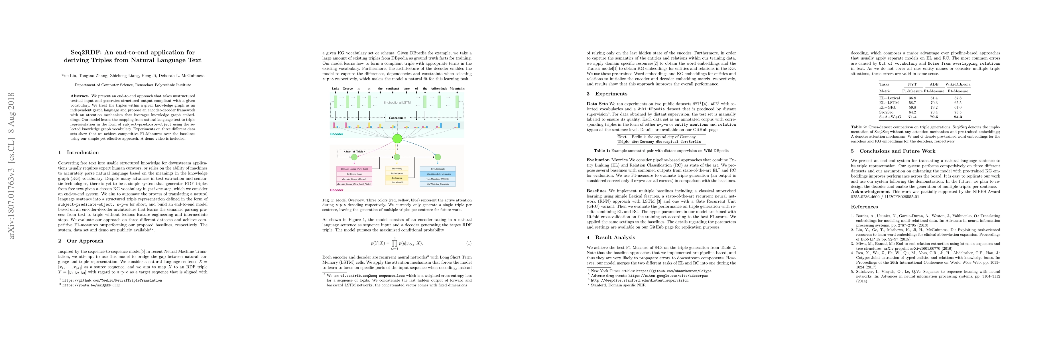 Seq2RDF employs an encoder-decoder framework to convert unstructured text into structured triples, leveraging knowledge graph embeddings and attention mechanisms. Experiments demonstrate competitive performance against baselines, achieving high F1-Measures.