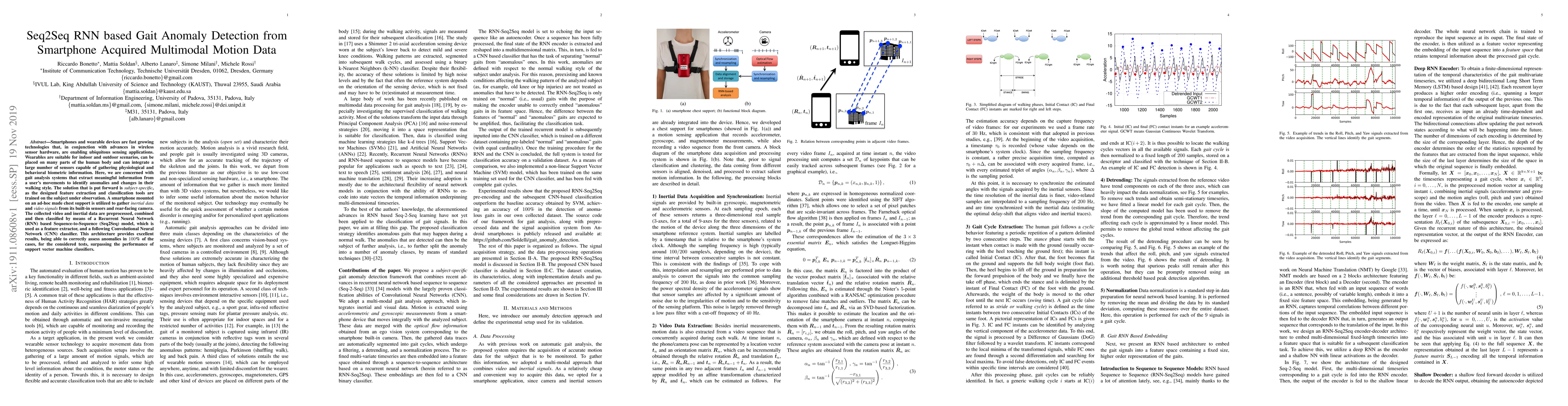 Smartphones and wearable devices are fast growing technologies that, in conjunction with advances in wireless sensor hardware, are enabling ubiquitous sensing applications. Wearables are suitable for indoor and outdoor scenarios, can be placed on many parts of the human body and can integrate a large number of sensors capable of gathering physiological and behavioral biometric information. Here, we are concerned with gait analysis systems that extract meaningful information from a user's movements to identify anomalies and changes in their walking style. The solution that is put forward is subject-specific, as the designed feature extraction and classification tools are trained on the subject under observation. A smartphone mounted on an ad-hoc made chest support is utilized to gather inertial data and video signals from its built-in sensors and rear-facing camera. The collected video and inertial data are preprocessed, combined and then classified by means of a Recurrent Neural Network (RNN) based Sequence-to-Sequence (Seq2Seq) model, which is used as a feature extractor, and a following Convolutional Neural Network (CNN) classifier. This architecture provides excellent results, being able to correctly assess anomalies in 100% of the cases, for the considered tests, surpassing the performance of support vector machine classifiers.