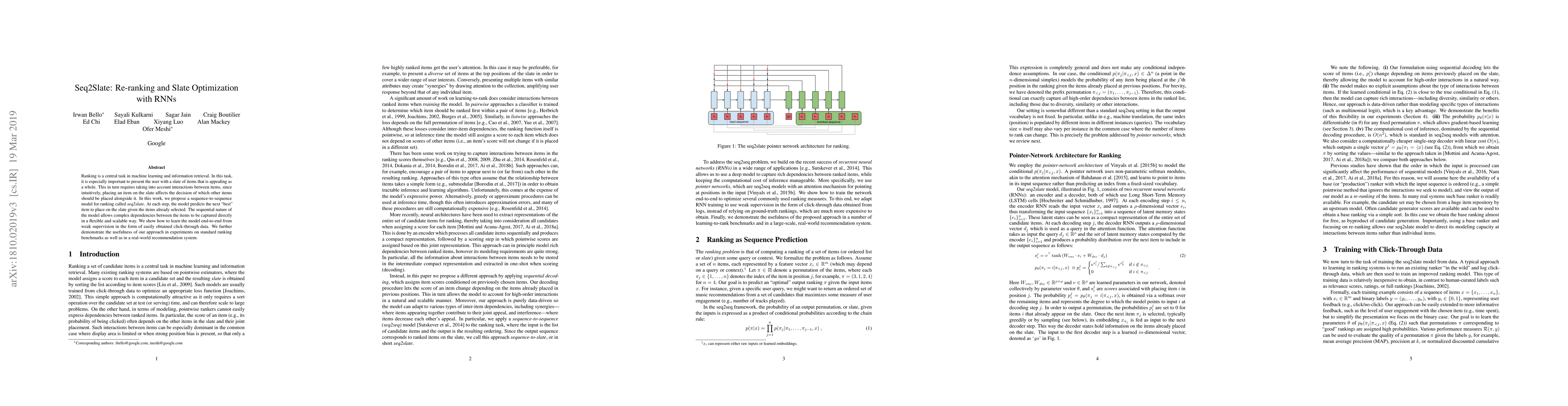 The paper introduces seq2slate, a sequence-to-sequence model for optimizing item slates in ranking tasks, capturing item interactions through its sequential nature. The model is trained end-to-end from click-through data and demonstrates effectiveness on both benchmarks and a real-world recommendation system.