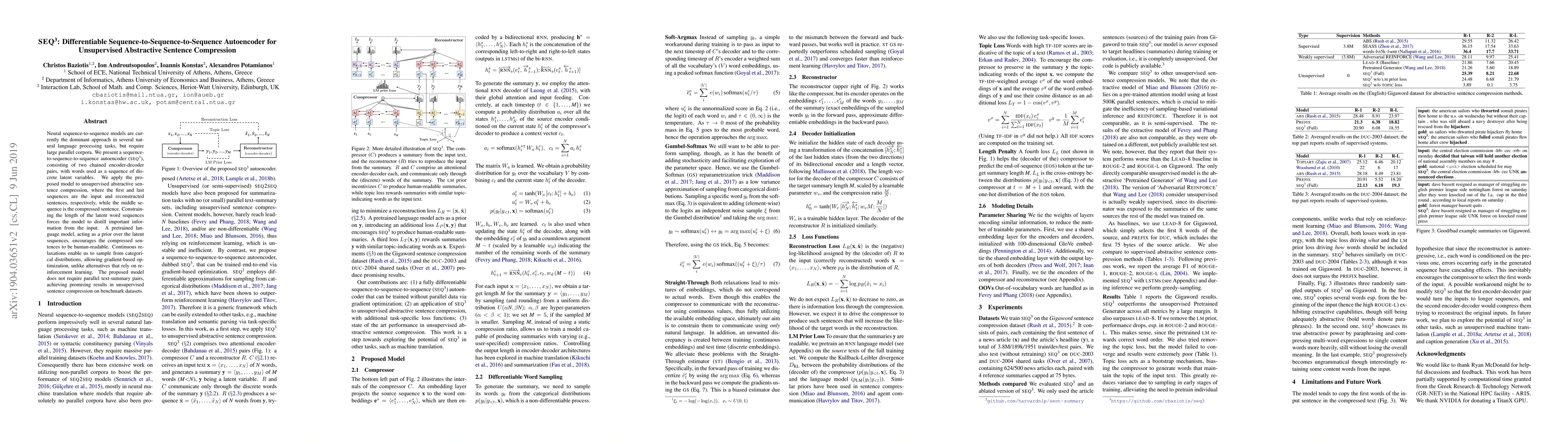 Neural sequence-to-sequence models are currently the dominant approach in several natural language processing tasks, but require large parallel corpora. We present a sequence-to-sequence-to-sequence autoencoder (SEQ^3), consisting of two chained encoder-decoder pairs, with words used as a sequence of discrete latent variables. We apply the proposed model to unsupervised abstractive sentence compression, where the first and last sequences are the input and reconstructed sentences, respectively, while the middle sequence is the compressed sentence. Constraining the length of the latent word sequences forces the model to distill important information from the input. A pretrained language model, acting as a prior over the latent sequences, encourages the compressed sentences to be human-readable. Continuous relaxations enable us to sample from categorical distributions, allowing gradient-based optimization, unlike alternatives that rely on reinforcement learning. The proposed model does not require parallel text-summary pairs, achieving promising results in unsupervised sentence compression on benchmark datasets.