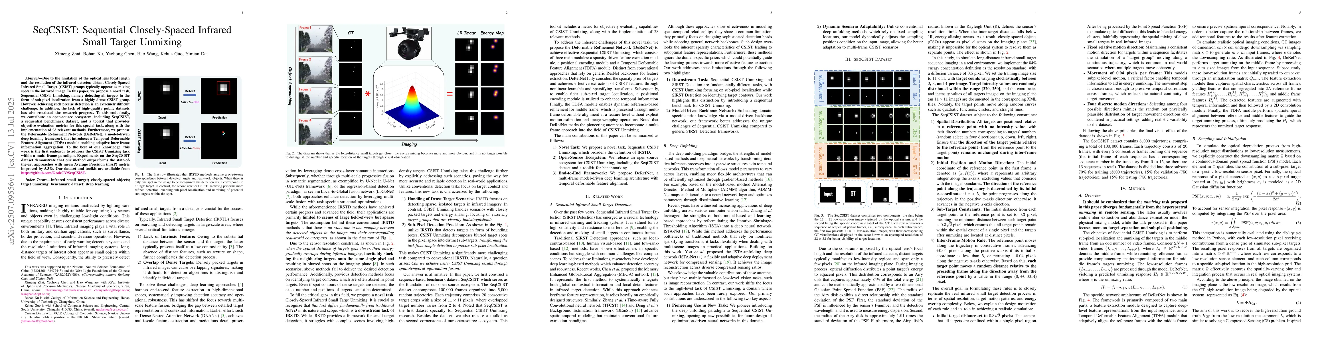 Due to the limitation of the optical lens focal length and the resolution of the infrared detector, distant Closely-Spaced Infrared Small Target (CSIST) groups typically appear as mixing spots in the infrared image. In this paper, we propose a novel task, Sequential CSIST Unmixing, namely detecting all targets in the form of sub-pixel localization from a highly dense CSIST group. However, achieving such precise detection is an extremely difficult challenge. In addition, the lack of high-quality public datasets has also restricted the research progress. To this end, firstly, we contribute an open-source ecosystem, including SeqCSIST, a sequential benchmark dataset, and a toolkit that provides objective evaluation metrics for this special task, along with the implementation of 23 relevant methods. Furthermore, we propose the Deformable Refinement Network (DeRefNet), a model-driven deep learning framework that introduces a Temporal Deformable Feature Alignment (TDFA) module enabling adaptive inter-frame information aggregation. To the best of our knowledge, this work is the first endeavor to address the CSIST Unmixing task within a multi-frame paradigm. Experiments on the SeqCSIST dataset demonstrate that our method outperforms the state-of-the-art approaches with mean Average Precision (mAP) metric improved by 5.3\%. Our dataset and toolkit are available from https://github.com/GrokCV/SeqCSIST.