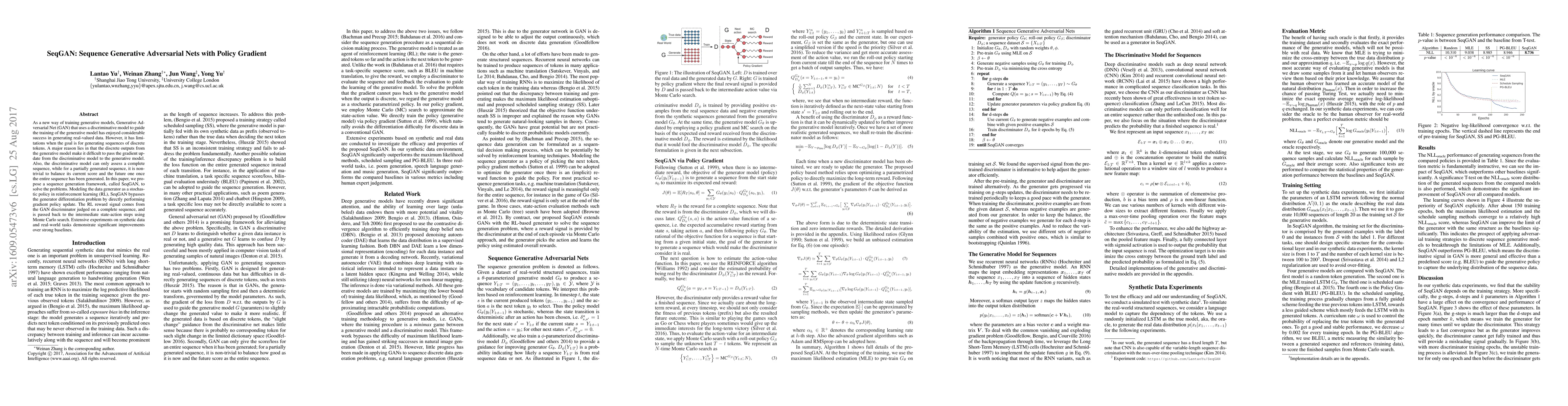 As a new way of training generative models, Generative Adversarial Nets (GAN) that uses a discriminative model to guide the training of the generative model has enjoyed considerable success in generating real-valued data. However, it has limitations when the goal is for generating sequences of discrete tokens. A major reason lies in that the discrete outputs from the generative model make it difficult to pass the gradient update from the discriminative model to the generative model. Also, the discriminative model can only assess a complete sequence, while for a partially generated sequence, it is non-trivial to balance its current score and the future one once the entire sequence has been generated. In this paper, we propose a sequence generation framework, called SeqGAN, to solve the problems. Modeling the data generator as a stochastic policy in reinforcement learning (RL), SeqGAN bypasses the generator differentiation problem by directly performing gradient policy update. The RL reward signal comes from the GAN discriminator judged on a complete sequence, and is passed back to the intermediate state-action steps using Monte Carlo search. Extensive experiments on synthetic data and real-world tasks demonstrate significant improvements over strong baselines.
