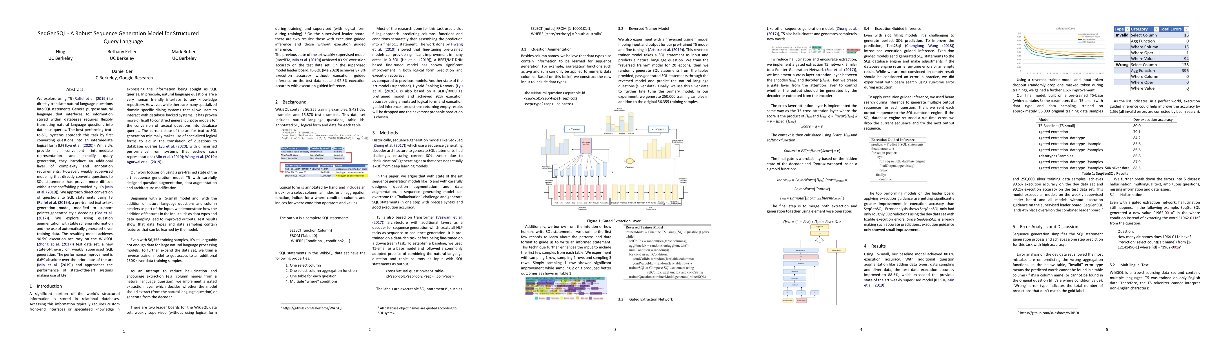 We explore using T5 (Raffel et al. (2019)) to directly translate natural language questions into SQL statements. General purpose natural language that interfaces to information stored within databases requires flexibly translating natural language questions into database queries. The best performing text-to-SQL systems approach this task by first converting questions into an intermediate logical form (LF) (Lyu et al. (2020)). While LFs provide a convenient intermediate representation and simplify query generation, they introduce an additional layer of complexity and annotation requirements. However, weakly supervised modeling that directly converts questions to SQL statements has proven more difficult without the scaffolding provided by LFs (Min et al. (2019)). We approach direct conversion of questions to SQL statements using T5 (Raffel et al. (2019)), a pre-trained textto-text generation model, modified to support pointer-generator style decoding (See et al. (2017)). We explore using question augmentation with table schema information and the use of automatically generated silver training data. The resulting model achieves 90.5% execution accuracy on the WikiSQL (Zhong et al. (2017)) test data set, a new state-of-the-art on weakly supervised SQL generation. The performance improvement is 6.6% absolute over the prior state-of-the-art (Min et al. (2019)) and approaches the performance of state-ofthe-art systems making use of LFs.